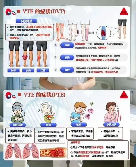 先摸清 VTE 的 “发病底细”。哪些人容易中招?老年人、癌症患者、肥胖人群、长期卧床者都是高危群体,久坐不动、吸烟等不良生活习惯也会让风险翻倍。它的症状有迹可循:DVT 会出现单侧下肢肿胀、疼痛、皮温升高等表现;PTE 则可能突发呼吸困难、胸痛、心跳加快,部分患者还会咯血。但要警惕,约 80% 的 DVT 病例无明显症状,很容易被忽视,这就需要我们多一份细心监测。
