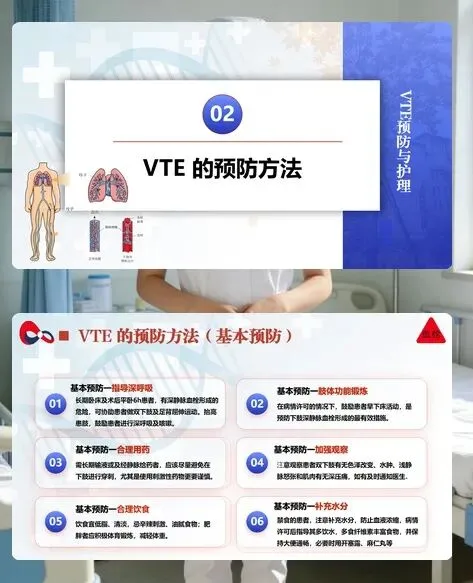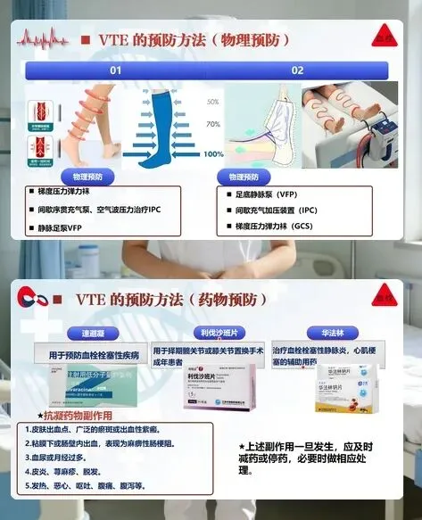再掌握预防的 “关键举措”。预防是应对 VTE 的核心,基本预防要落地:病情允许时,鼓励患者早下床活动,协助做肢体屈伸、深呼吸等锻炼;合理饮食、补充水分,避免血液浓缩;长期输液尽量避开下肢穿刺。物理预防可借助梯度压力弹力袜、间歇充气加压装置等,促进血液回流;高危患者需遵医嘱使用华法林、利伐沙班等抗凝药物,同时密切观察有无出血倾向。