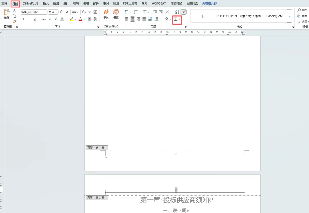 双击页眉,在页眉编辑状态下,按Ctrl+A全选页眉,然后回到开始菜单栏,点击边框下的下拉按钮。