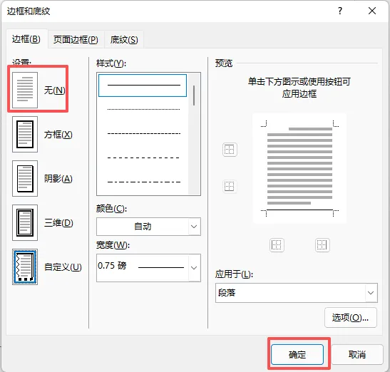 选择“无”后点击确定即可。页眉中的横线就可以删除了。