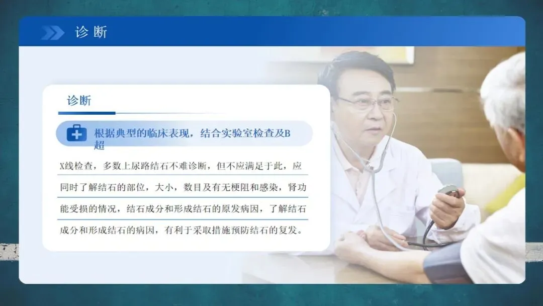诊断方面,医生通常会借助超声、KUB平片、静脉肾盂造影或CT等检查来明确结石的位置、大小和形态。