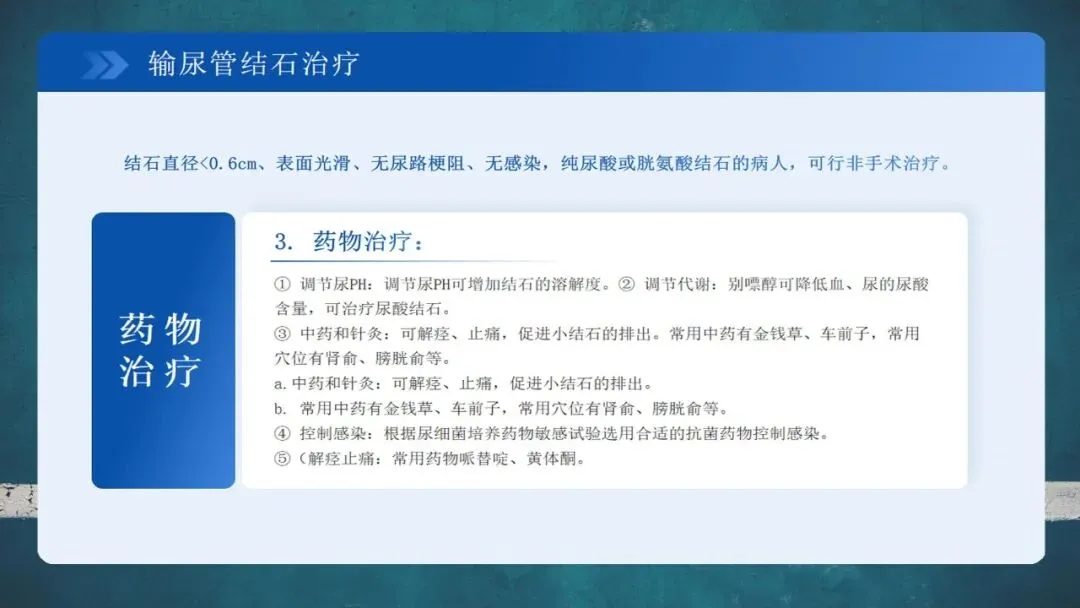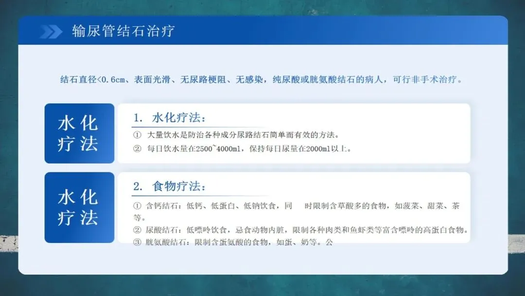 治疗上,并非所有结石都需要手术。如果结石直径小于0.6厘米、表面光滑、无梗阻或感染,尤其是尿酸或胱氨酸类结石,可通过多饮水、药物排石等非手术治疗。若结石较大或症状严重,则需考虑体外冲击波碎石或手术治疗。
