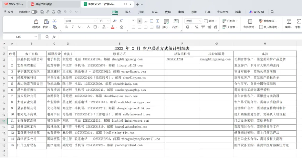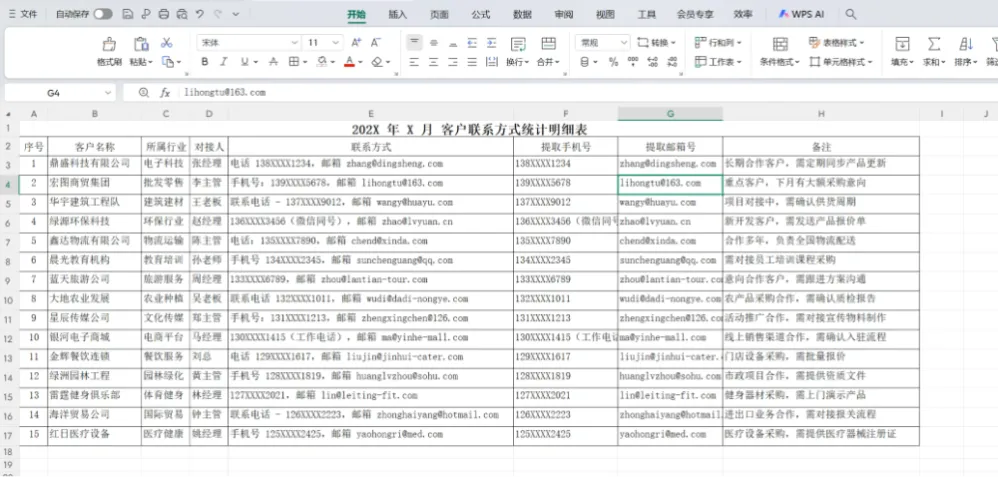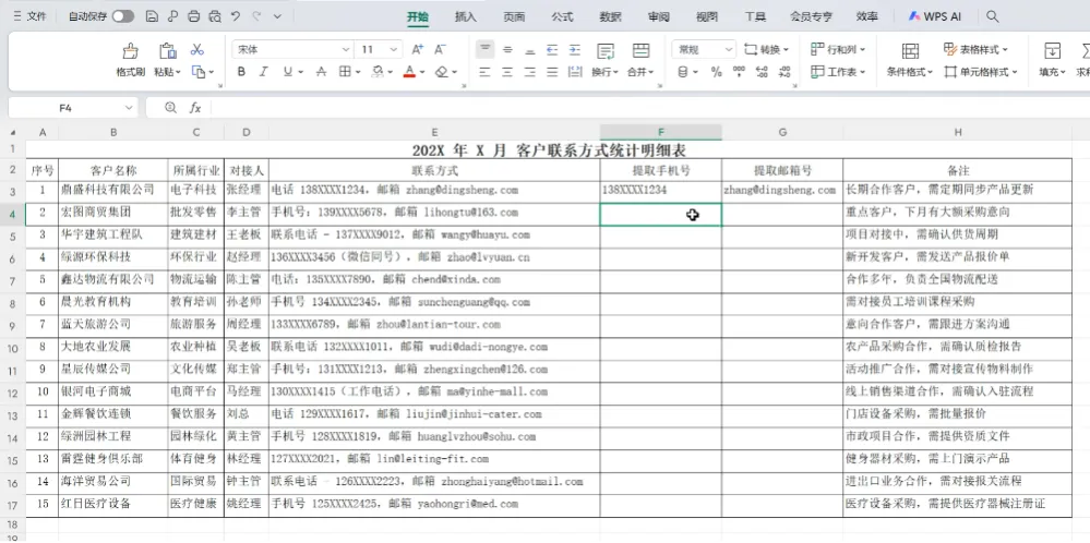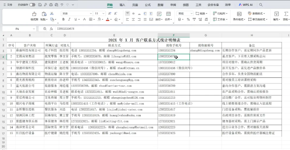 5. 快速提取表格中的手机号 / 邮箱(统计联系方式必用)整理客户信息表、员工联系方式表时,手机号、邮箱常混杂在文字中,手动复制又慢又易错!用 Excel「Ctrl+E 快速填充」功能,智能识别规律,一键批量提取,新手也能秒会~✅ 操作步骤(以样表为例,分手机号、邮箱提取):一、提取手机号(纯 11 位数字)在样表中新增「提取手机号」如F列,选中 E3单元格的混杂内容的电话 “138XXXX1234”复制,粘贴到F3单元格(仅需输入这一个示例,Excel 会自动识别规律);然后选中 F4 单元格,按下键盘「Ctrl+E」组合键,Excel 会智能识别所有 11 位手机号格式,自动剥离前缀文字、括号备注等无关内容,批量填充纯手机号!