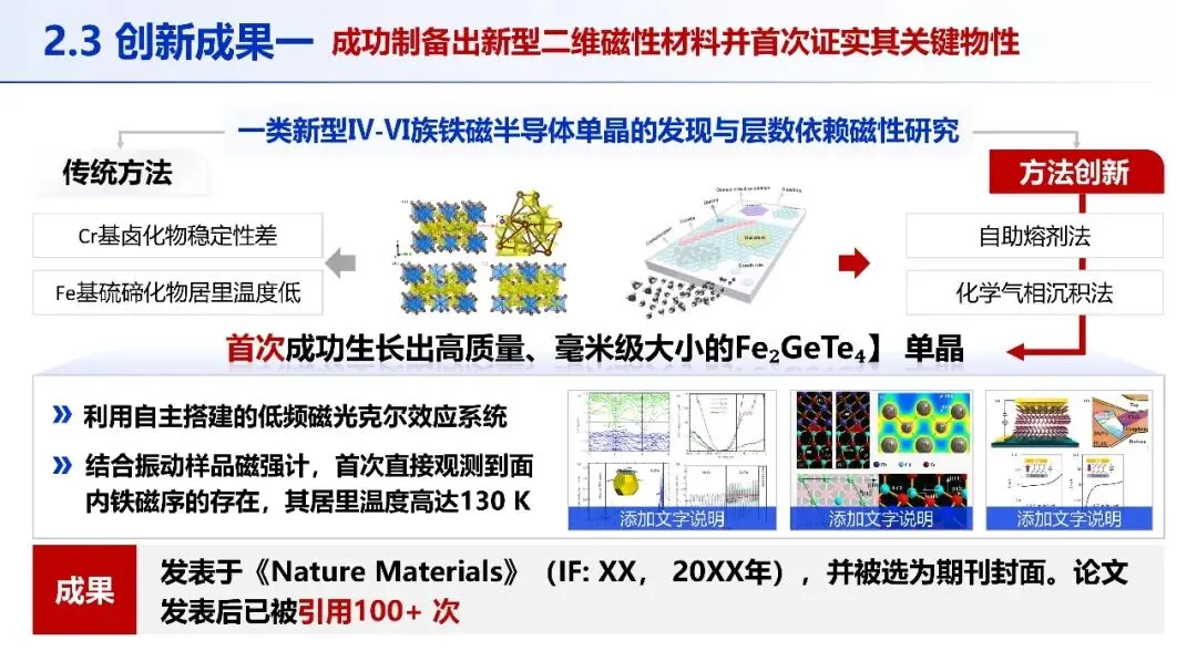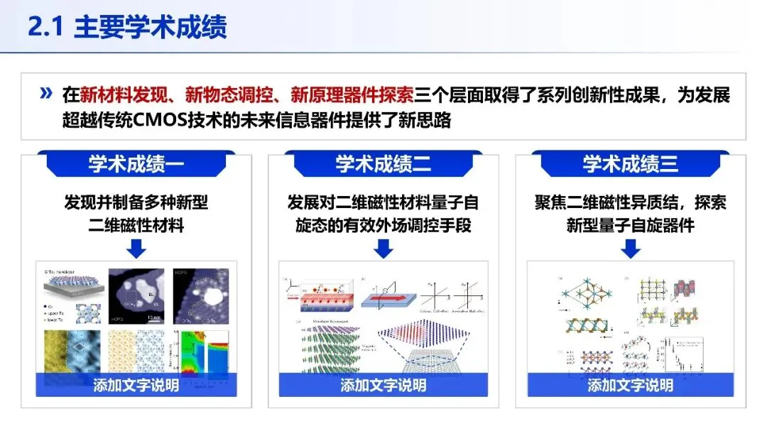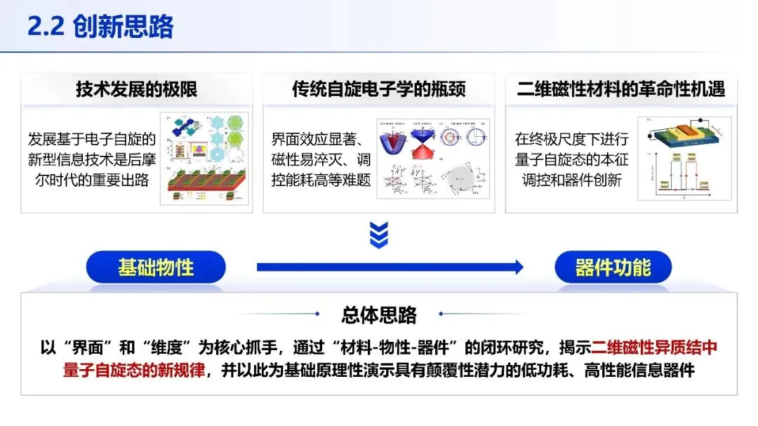 PPT 以 “创新思路 — 创新成果” 为主线,先阐明二维磁性材料的革命性机遇,提出以 “界面” 和 “维度” 为核心的总体研究思路;再通过三项核心成果,从新型二维磁性材料制备、磁态调控新方法到高性能器件演示,层层递进,完整呈现研究的系统性与创新性。