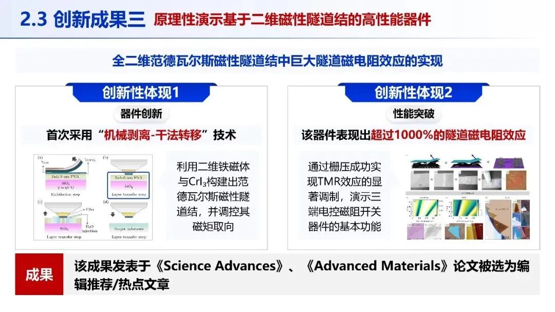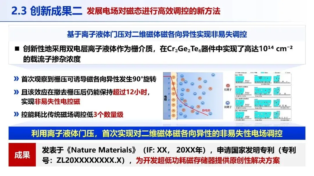 材料突破:首次成功制备出毫米级高质量 Fe₂GeTe₄单晶,通过自研观测系统证实其面内铁磁序,居里温度高达 130 K,相关成果发表于《Nature Materials》并被选为封面,被引用超 100 次,为后续研究奠定了核心材料基础。调控创新:发展基于离子液体门压的磁态调控新方法,在 Cr₂Ge₂Te₆器件中实现磁各向异性 90° 旋转的非易失性电控,控能耗比传统方法降低 3 个数量级,为超低功耗存储器提供原创性方案,相关成果发表于《Nature Materials》并获国家发明专利。器件验证:采用 “机械剥离 - 干法转移” 技术构建全二维范德瓦尔斯磁性隧道结,实现超 1000% 的隧道磁电阻效应,演示了三端电控磁阻开关功能,相关成果发表于《Science Advances》等顶刊,验证了技术的器件化潜力。四、评价