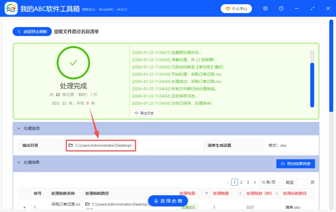 4、等待几秒钟就提取完成了,直接点输出目录查看,表格里文件名、文件路径井然有序。