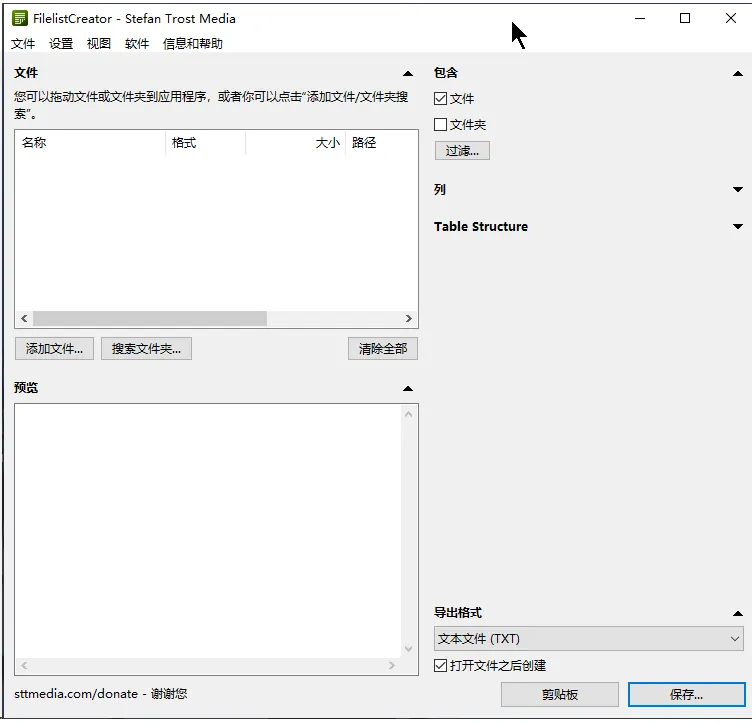 1、打开文件列表生成器(Filelist Creator),点击【添加文件】导入所有文件,在右侧选择需要导出的信息,下面的预览界面可以实时查看效果。