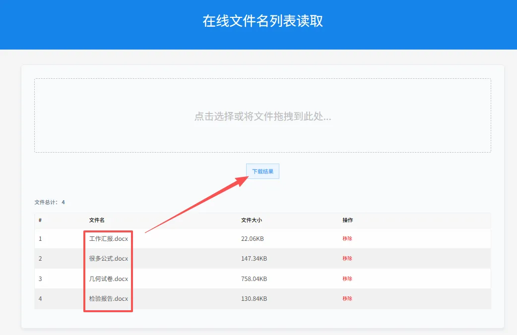 搜索打开【在线文件名列表读取】,上传或直接拖拽文件,点击【下载结果】即可。