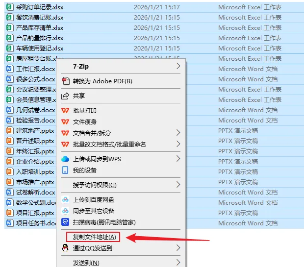 1、打开目标文件夹,按【Ctrl+A】全选,Shift+右键选择【复制文件地址】。