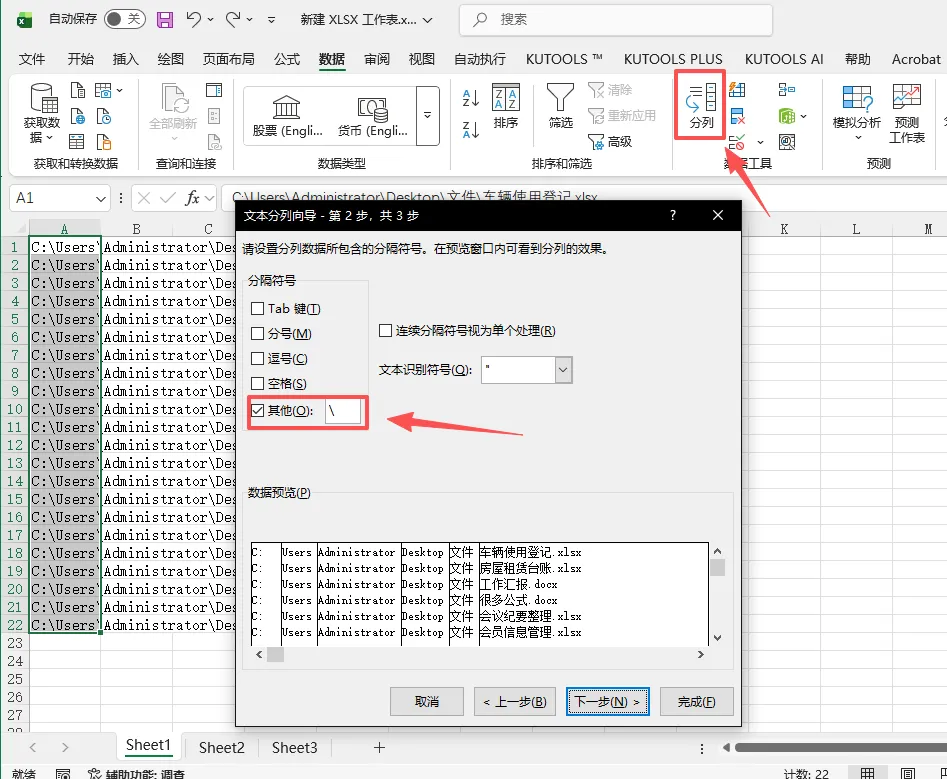3、选中文件地址这一列,点击上方工具栏的【分列】,选择【分隔符号】,下一步勾选【其他】,在右侧的文本框里输入【\】,再下一步设置目标区域为【$B$1】,点击【完成】。