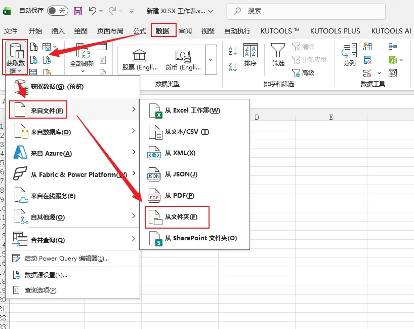 1、新建一个xlsx工作表,点击【数据】-【获取数据】-【来自文件】-【从文件夹】,选择目标文件夹,导入所有文件名。