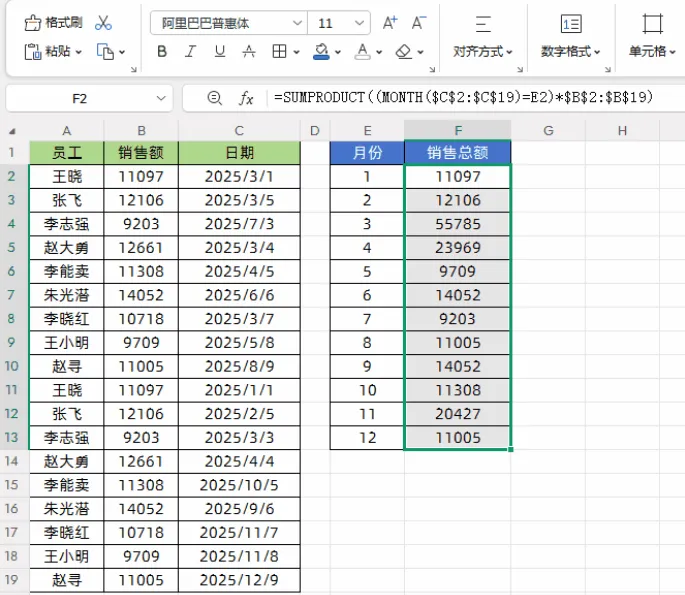 =SUMPRODUCT((MONTH(日期列)=目标月份单元格)*求和数据列)=SUMPRODUCT((MONTH($C$2:$C$19)=E2)*$B$2:$B$19)将鼠标放在F2单元格右下角,当鼠标变成黑色“+”号时,双击或向下拖动,即可快速完成所有月份的汇总。MONTH($C$2:$C$19):用MONTH函数提取C列所有日期对应的月份数字(如3月1日→3)。(...=E2):判断提取出的月份是否等于E2单元格的数字“1”。这一步会得到一列TRUE(代表是1月)或FALSE(代表不是1月)。在计算时,TRUE相当于1,FALSE相当于0。于是公式变成了:SUMPRODUCT( {1,0,0,1,...} * {11097, 12106, 9203, 12661,...} ),即只对1月的数据进行“1 * 数据”的运算,对其他月的数据进行“0 * 数据”的运算。最后,SUMPRODUCT将所有乘积结果相加,自然就得到了1月的总和。关键:使用$符号对数据区域进行绝对引用(如$C$2:$C$19),这样下拉填充公式时,引用的范围才不会错乱。方法二:直观高效——FILTER + SUM组合(推荐新版Excel用户)