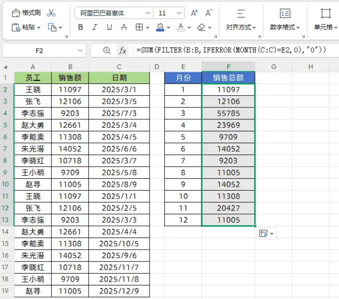 =SUM(FILTER(求和数据列, MONTH(日期列)=目标月份单元格, 0))=SUM(FILTER(B:B,IFERROR(MONTH(C:C)=E2,0),"0"))FILTER($B$2:$B$19, MONTH($C$2:$C$19)=E2, 0):这是核心部分。它的意思是“从B2:B19销售额数据中,筛选出那些C2:C19日期月份等于E2(1月)的数据行”。如果找不到符合条件的(比如某个月份没数据),则返回我们指定的0,避免出现错误值。SUM(...):最后用SUM函数对FILTER筛选出的所有数据进行求和。