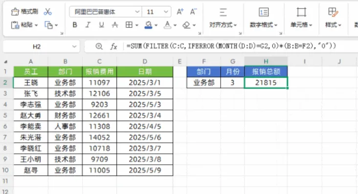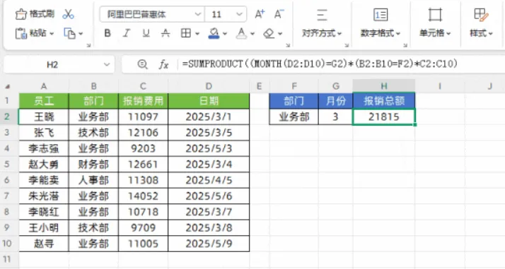 问题升级了!现在我们要同时满足“部门”和“月份”两个条件。方法一:SUMPRODUCT多条件求和