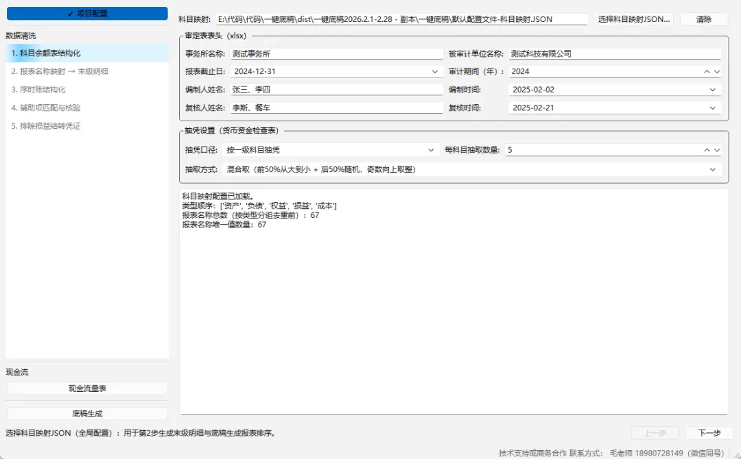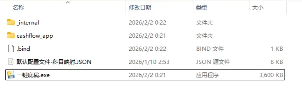 我把这条路压缩成了一个顺序按钮流程:你负责“选对文件 + 对齐字段 + 看一眼校验报告”,剩下的交给程序跑。下面我用截图把每一步讲清楚:这一步在干什么、为什么要做、以及它在背后做了什么。后附免费使用的一键底稿工具。图 1:解压后的文件夹结构(你真正需要关注的就两个:exe + 科目映射 JSON)