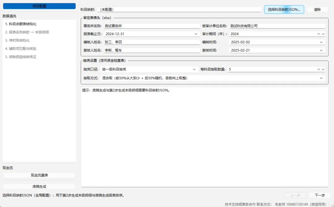 项目配置里要做两件事:①选科目映射 JSON;②把审定表表头信息(事务所名称,复核人姓名等)一次填好(后面导出底稿会自动带上)。