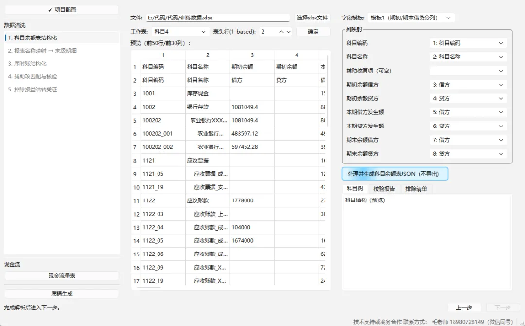 点击“处理并生成科目余额表JSON(不导出)”,程序会做:行清洗(合计行/空编码等)、金额格式化、科目树生成。