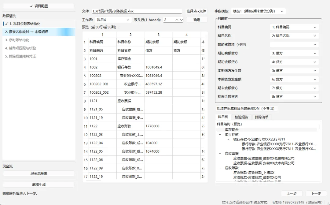 右侧把“列映射”对齐:科目编码/科目名称/辅助核算项/期初/本期发生/期末等字段,一次对齐后程序才能做校验与结构化。