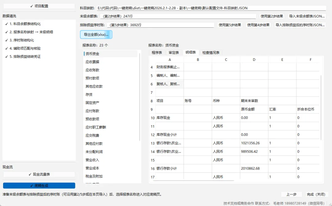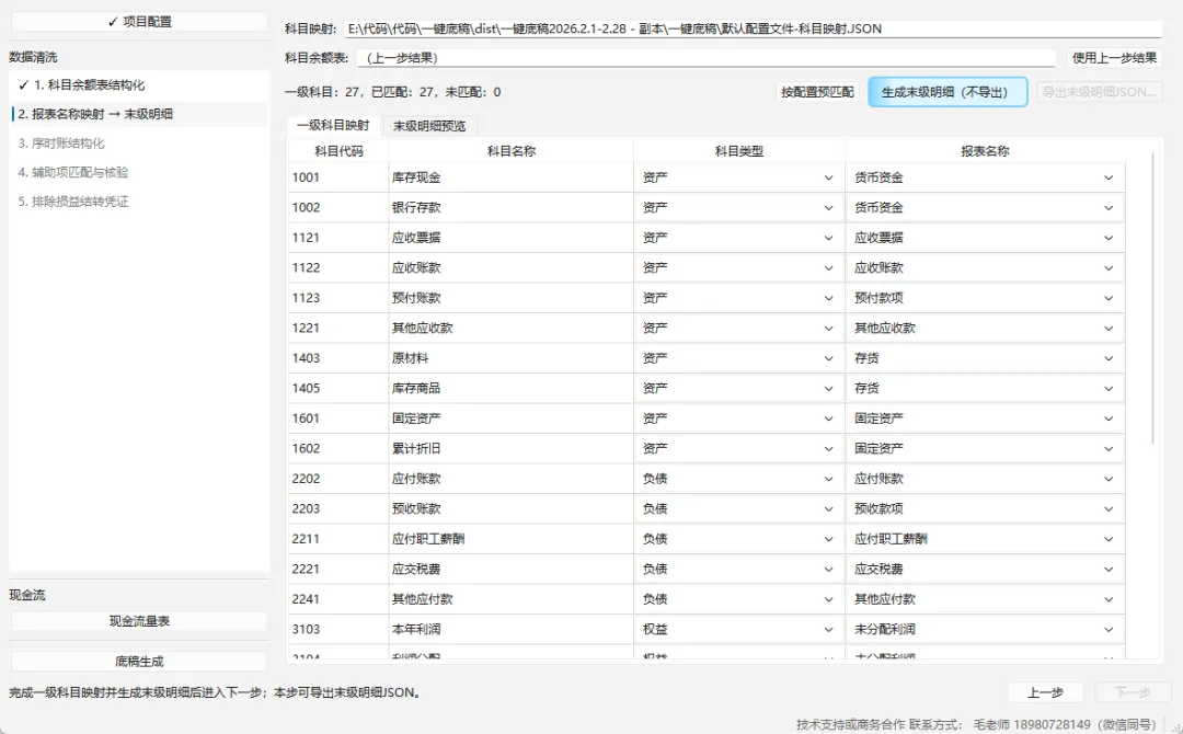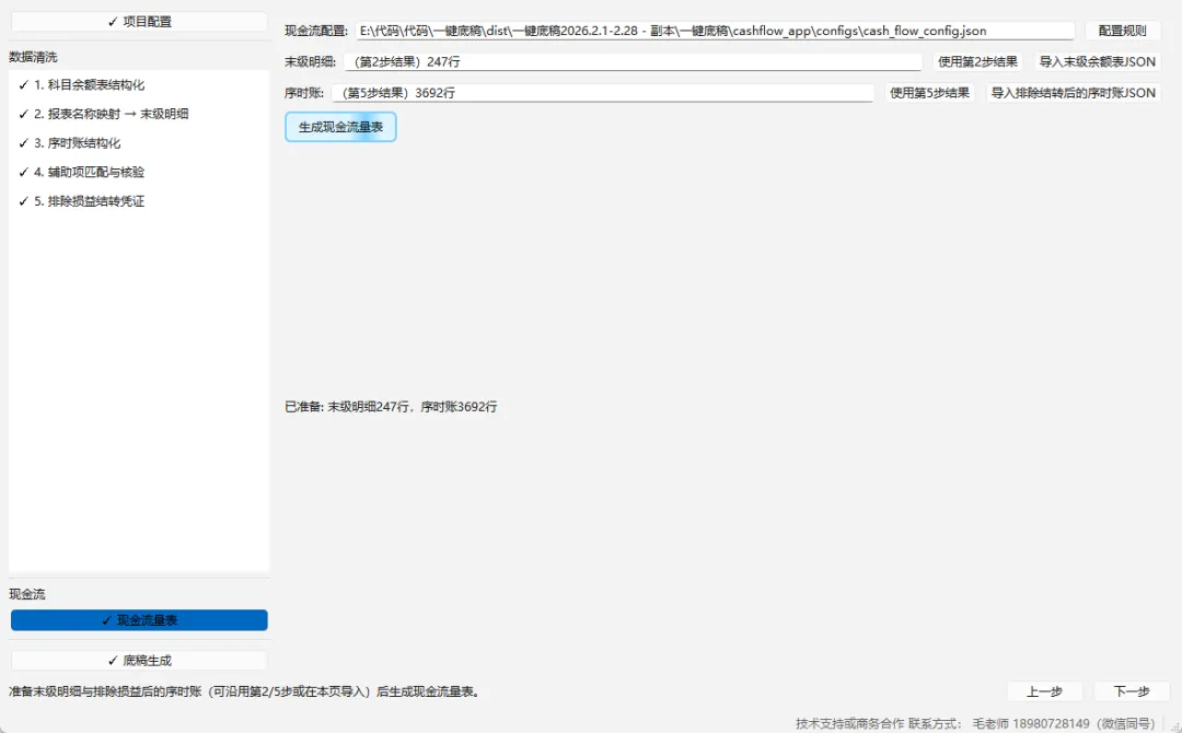左侧就是完整路线:项目配置→ 数据清洗(1~5)→ 现金流量表 → 底稿生成。