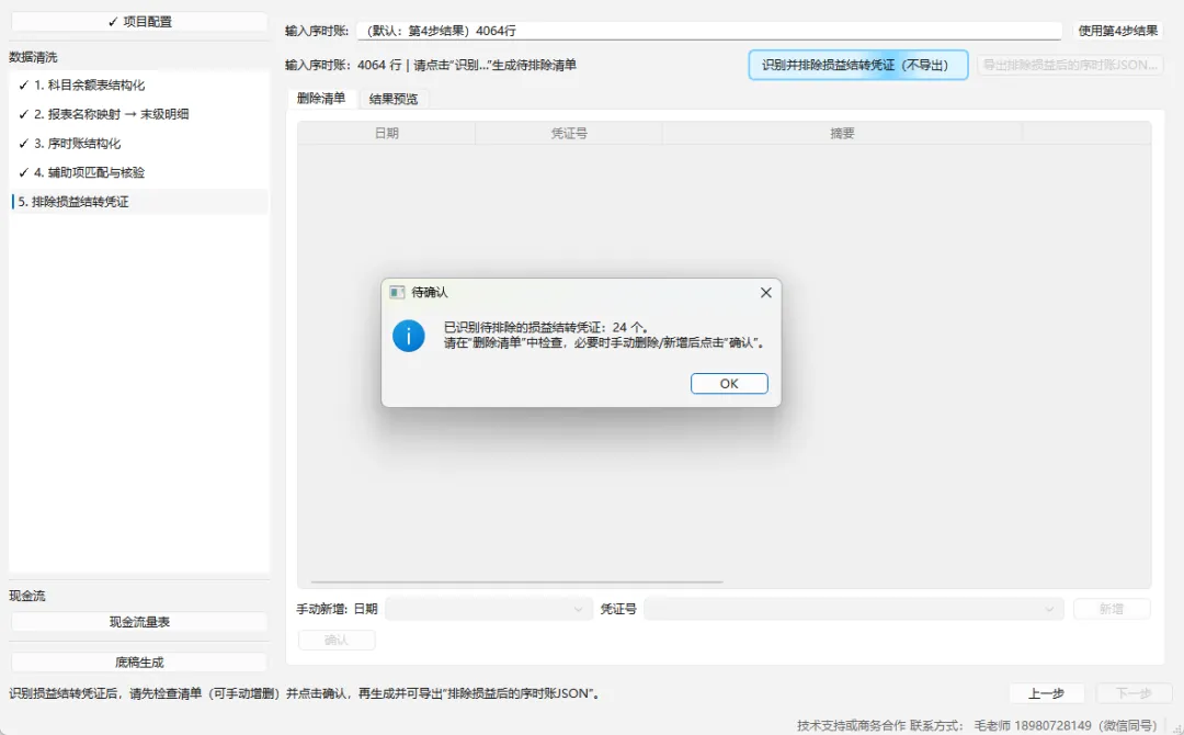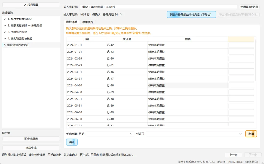 程序会先按“日期+凭证号”把分录聚成凭证集,自动识别疑似损益结转;你可以删除误判、也可以手动新增漏掉的。