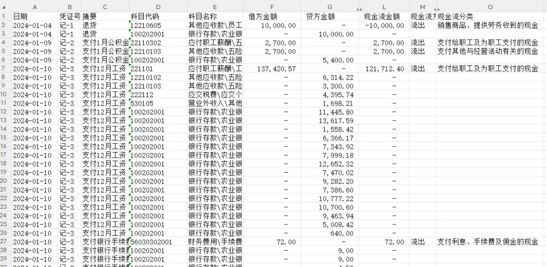 每一行都保留了:日期/凭证号/摘要/科目/借贷金额,并追加了现金流金额、流入/流出、分类名称。