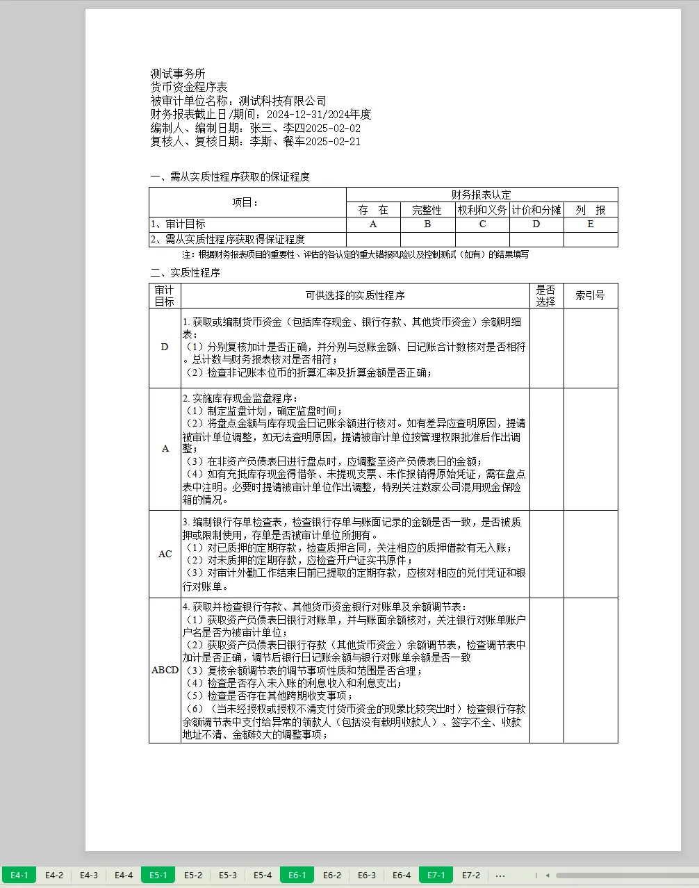 图 16:程序表示例(以货币资金为例:审计目标/程序/索引号自动铺好)