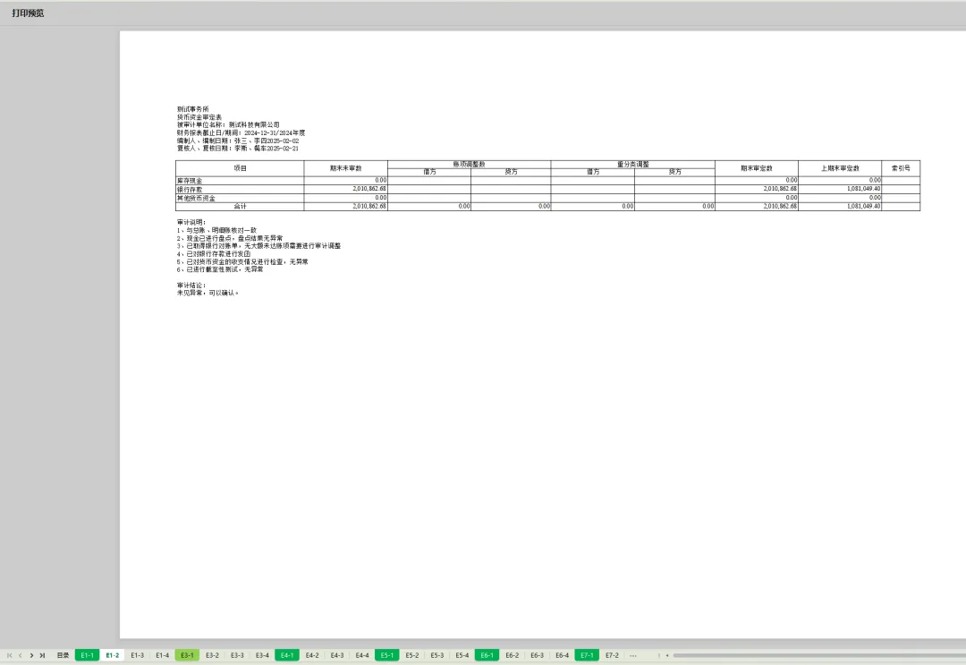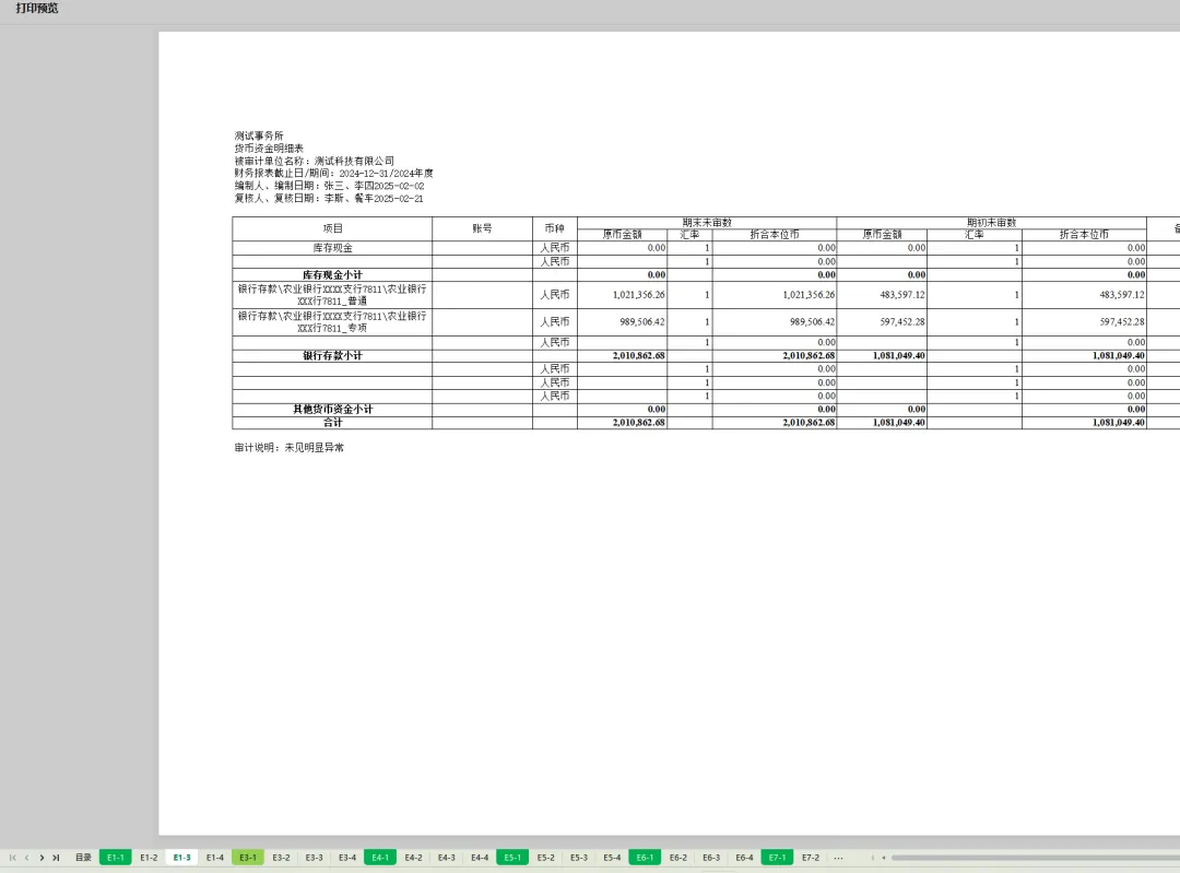 审定表会把关键余额结构呈现出来(例如库存现金/银行存款/其他货币资金的小计与合计)。