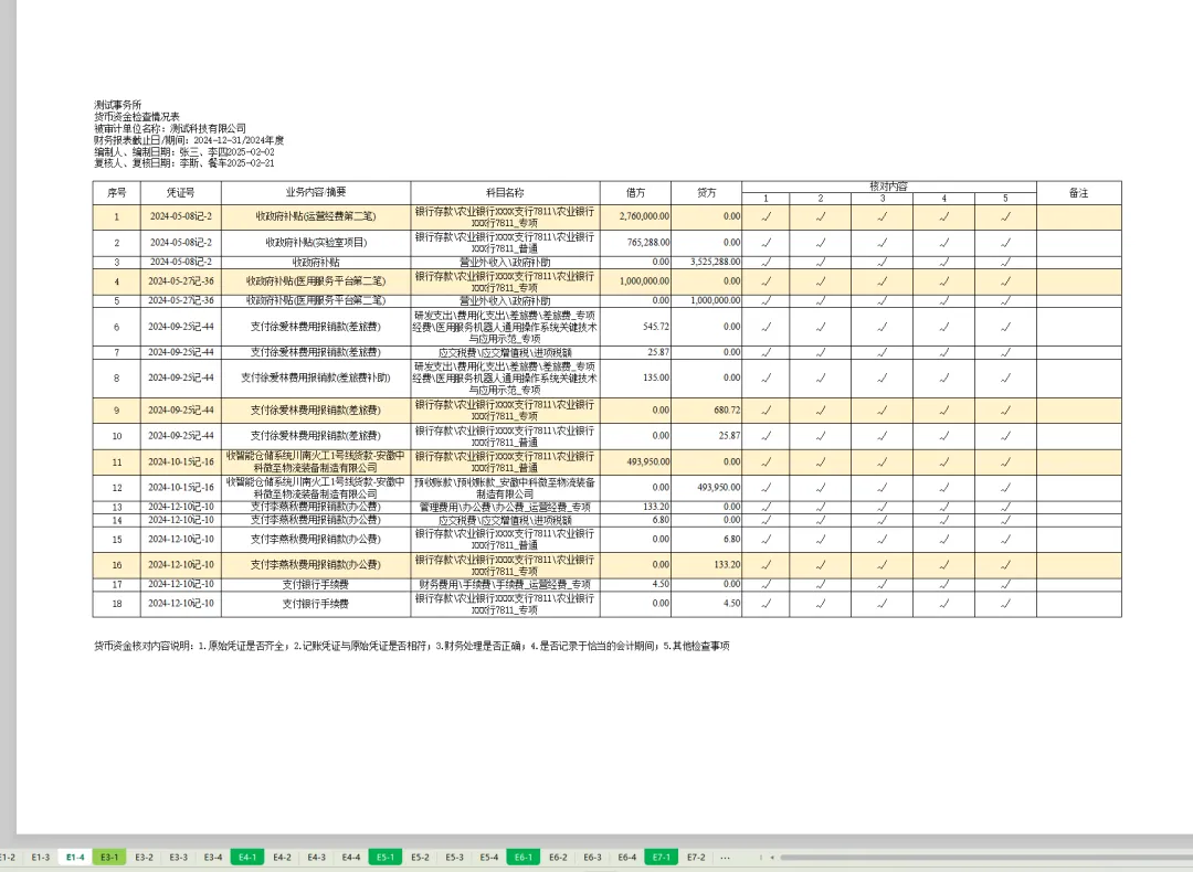 图 19:检查情况表:抽凭代表行 + 同凭证分录展开(抽查行高亮,方便现场核对)