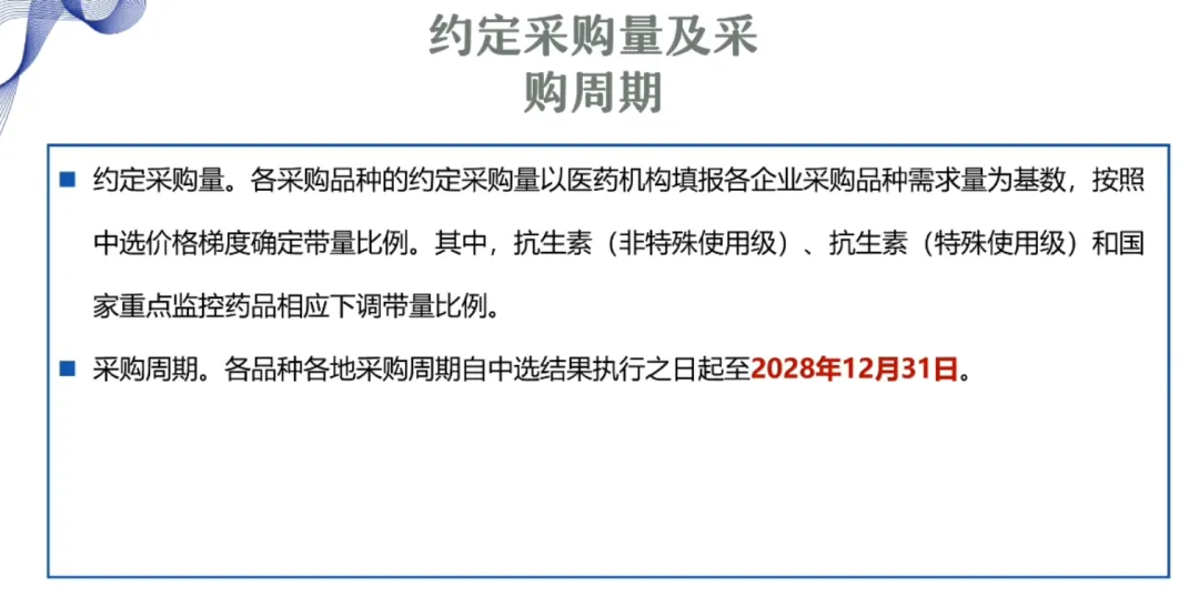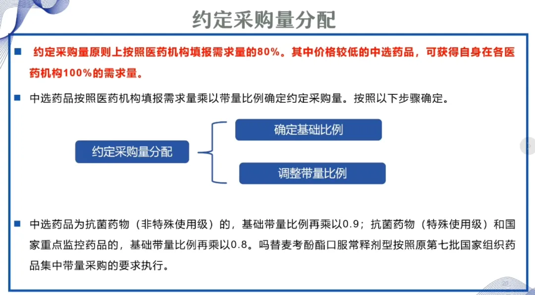 中选药品为抗菌药物(非特殊使用级)的,基础带量比例再乘以 0.9;抗菌药物(特殊使用级)和国家重点监控药品的,基础带量比例再乘以 0.8。吗替麦考酚酯口服常释剂型按照原第七批国家组织药品集中带量采购的要求执行。