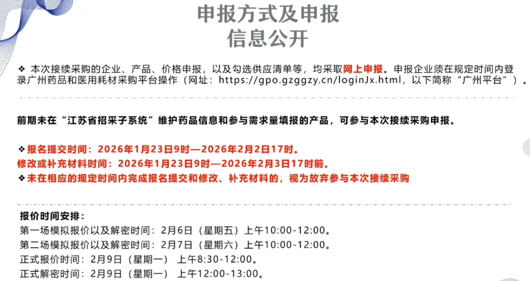 修改或补充材料时间:2026 年 1 月 23 日 9 时—2026 年 2 月3 日 17 前。未在相应的规定时间内完成报名提交和修改、补充材料的,视为放弃参与本次接续采购。
