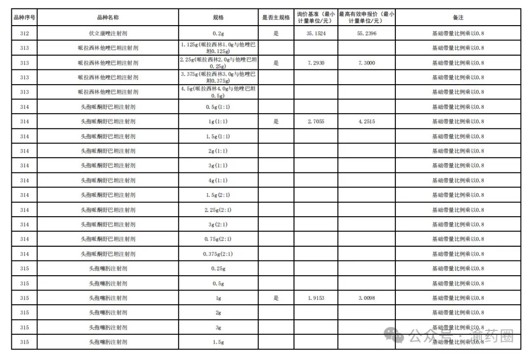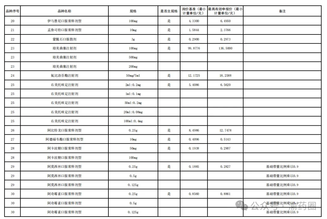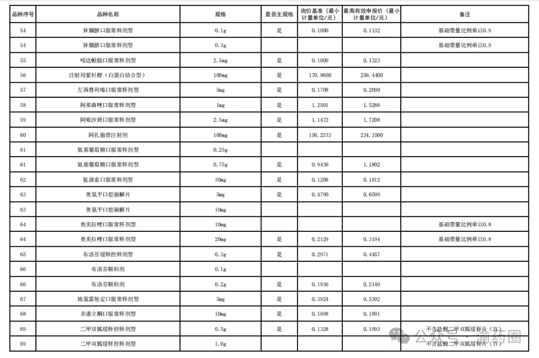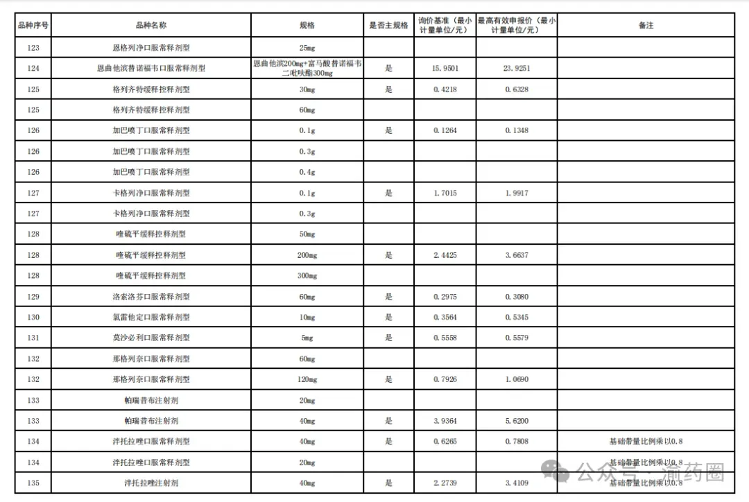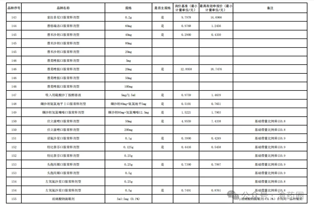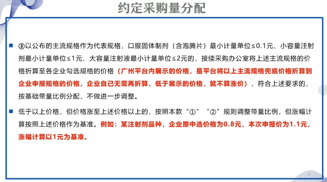③以公布的主流规格作为代表规格,口服固体制剂(含泡腾片)最小计量单位≤0.1 元、小容量注射剂最小计量单位≤1 元、大容量注射液最小计量单位≤2 元的。接续采购办公室将上述主流规格的价格折算至各企业勾选规格的价格,符合上述要求的,按基础带量比例分配,不做进一步调整。低于以上价格,但价格涨至上述价格以上的,按照本款“①”“②”规则调整带量比例,但涨幅计算按照上述价格作为基准。