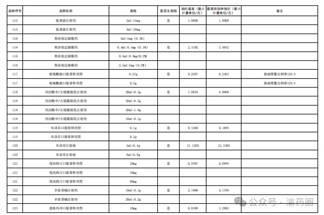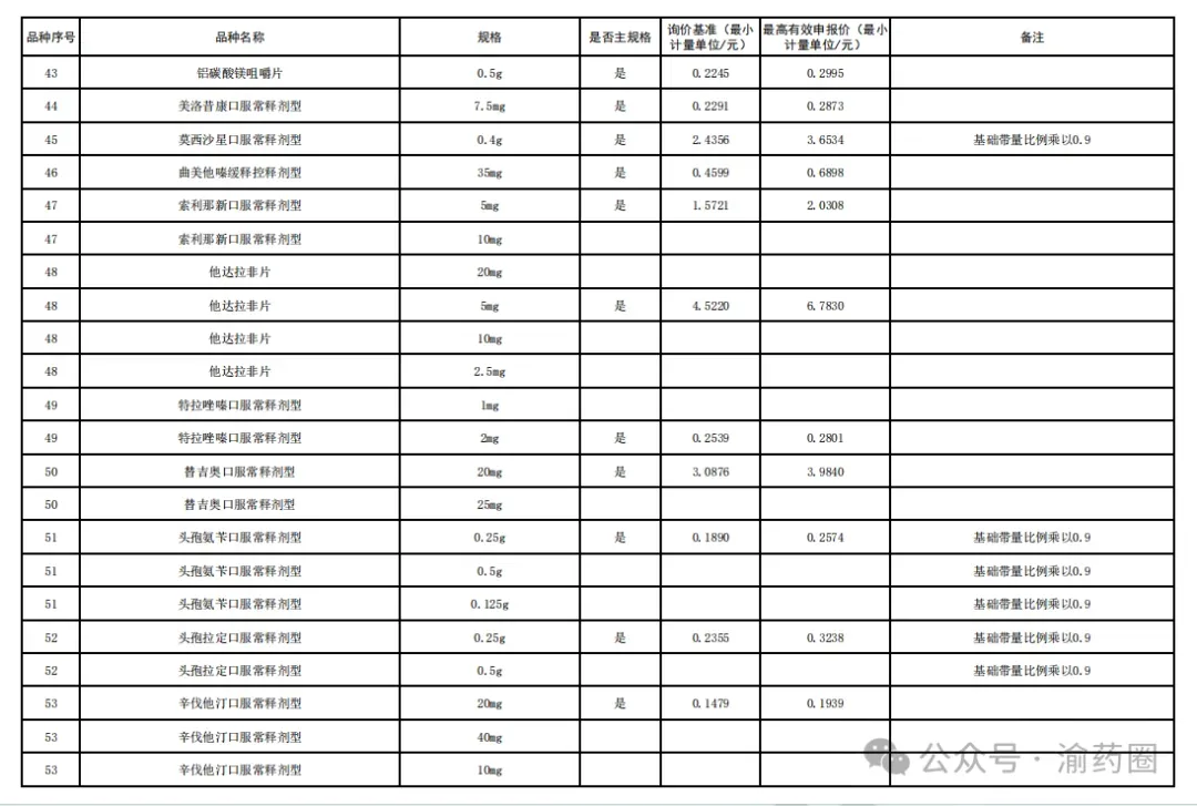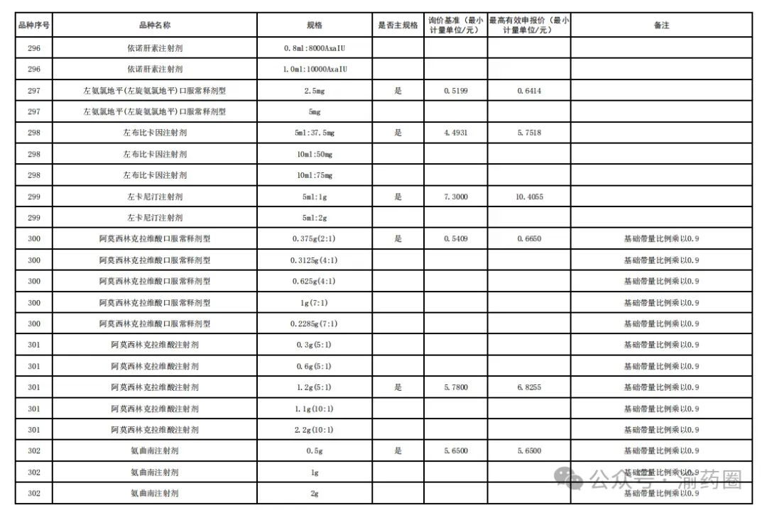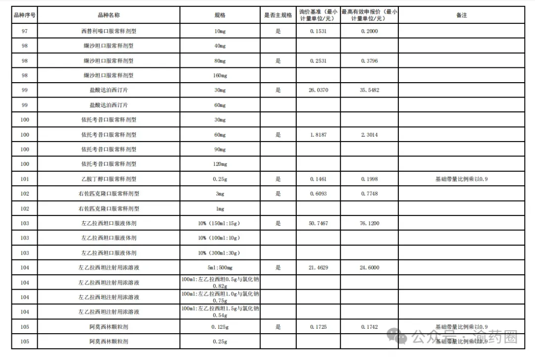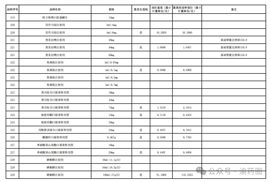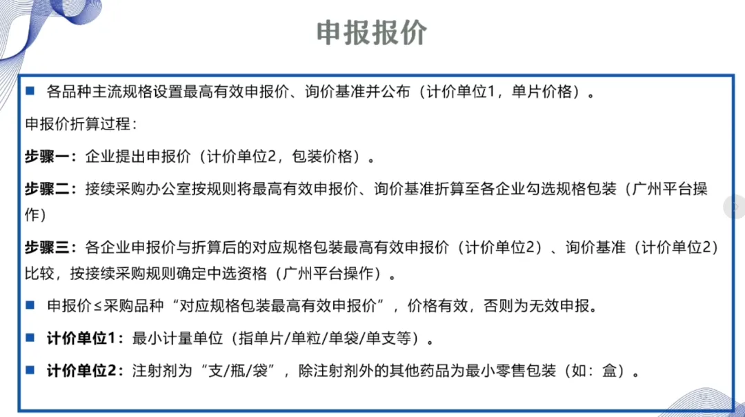 ③以公布的主流规格作为代表规格,口服固体制剂(含泡腾片)最小计量单位≤0.1 元、小容量注射剂最小计量单位≤1 元、大容量注射液最小计量单位≤2 元的。接续采购办公室将上述主流规格的价格折算至各企业勾选规格的价格,符合上述要求的,按基础带量比例分配,不做进一步调整。低于以上价格,但价格涨至上述价格以上的,按照本款“①”“②”规则调整带量比例,但涨幅计算按照上述价格作为基准。