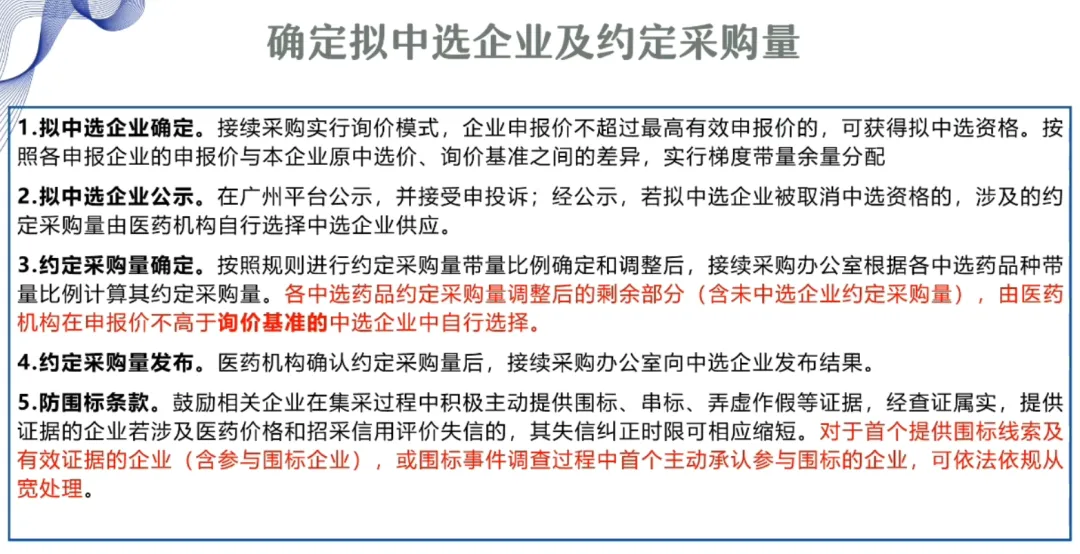 接续采购办公室根据各中选药品种带量比例计算其约定采购量。各中选药品约定采购量调整后的剩余部分,由医药机构在企业申报价不高于询价基准的中选企业中自行选择。