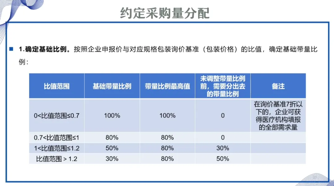1.确定基础比例。按照企业申报价与对应规格包装询价基准(计价单位 2)的比值,分别确定基础带量比例: