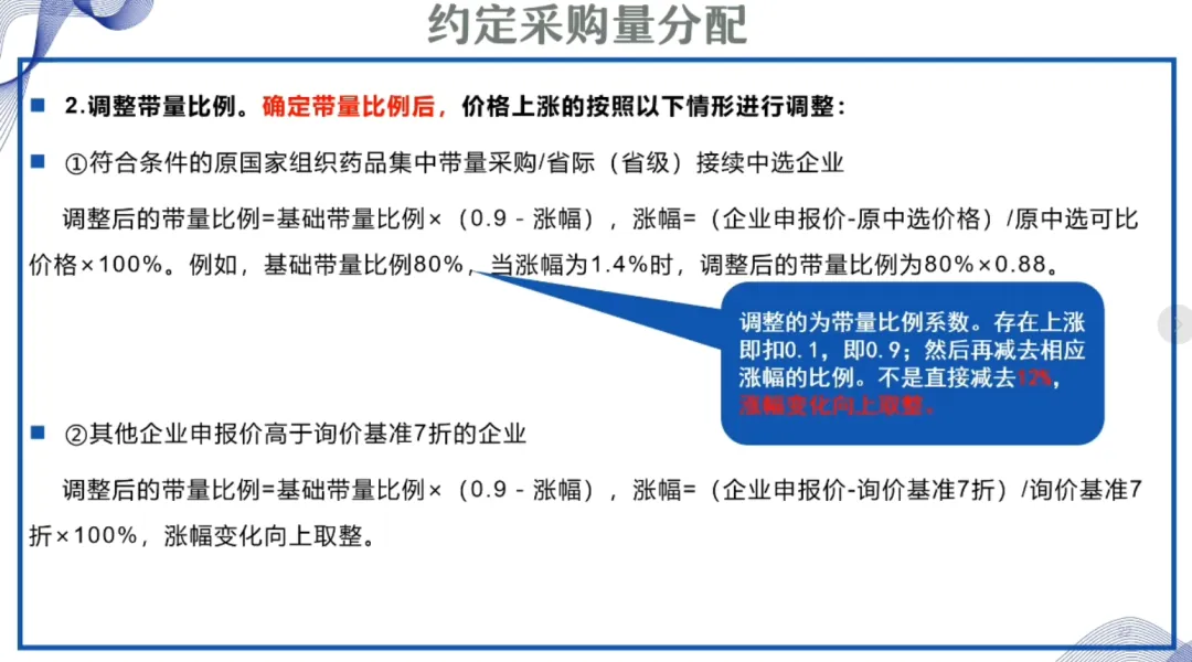 ①符合条件的原国家组织药品集中带量采购/省际(省级)接续中选企业,申报价高于原中选价格的,调整后的带量比例= 基础带量比例×(0.9-涨幅),涨幅=(企业申报价-原中选价格)/原中选价格×100%,涨幅变化向上取整。例如,基础带量比例80%,当涨幅为 1.4%时,调整后的带量比例为 80%×0.88。