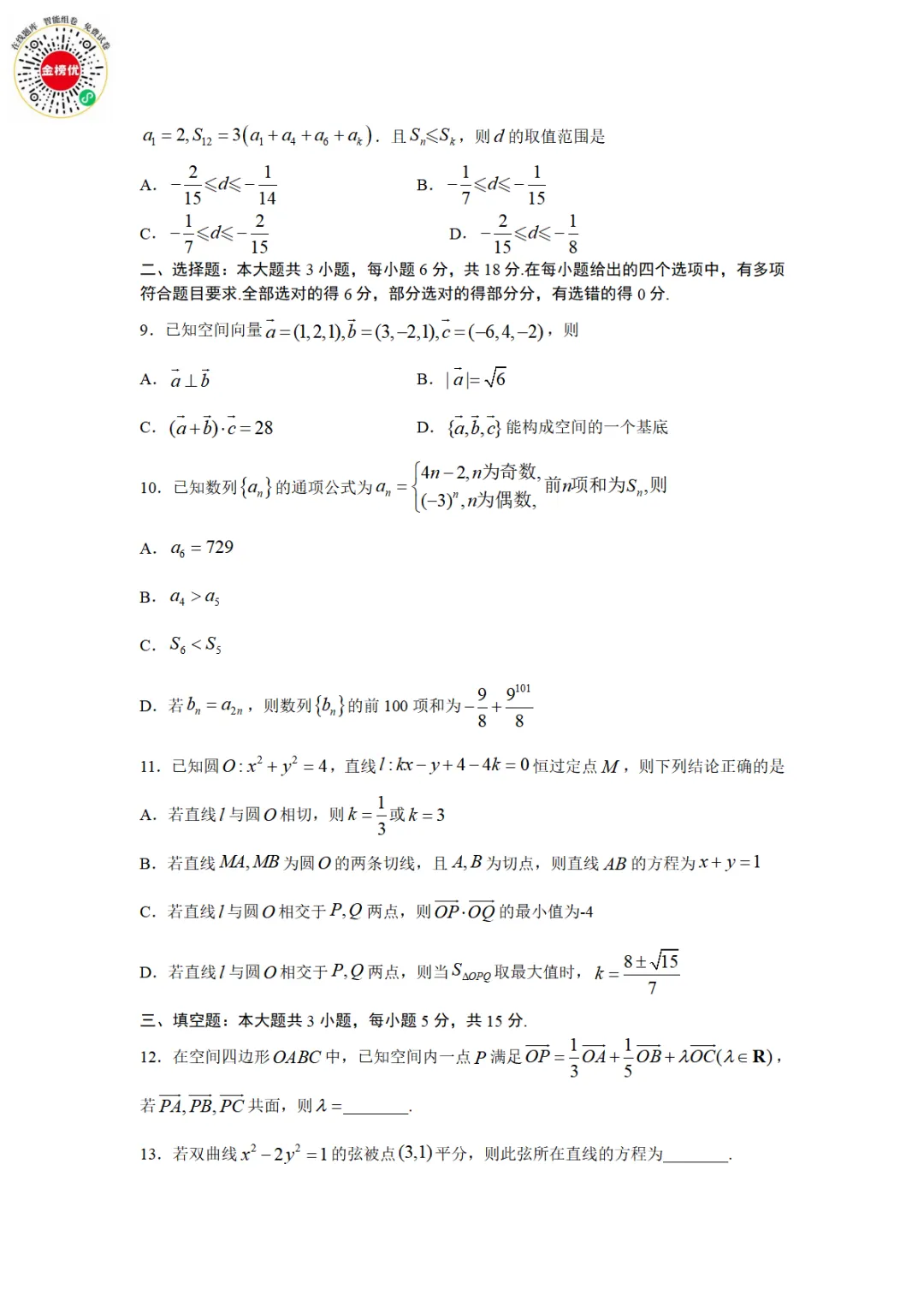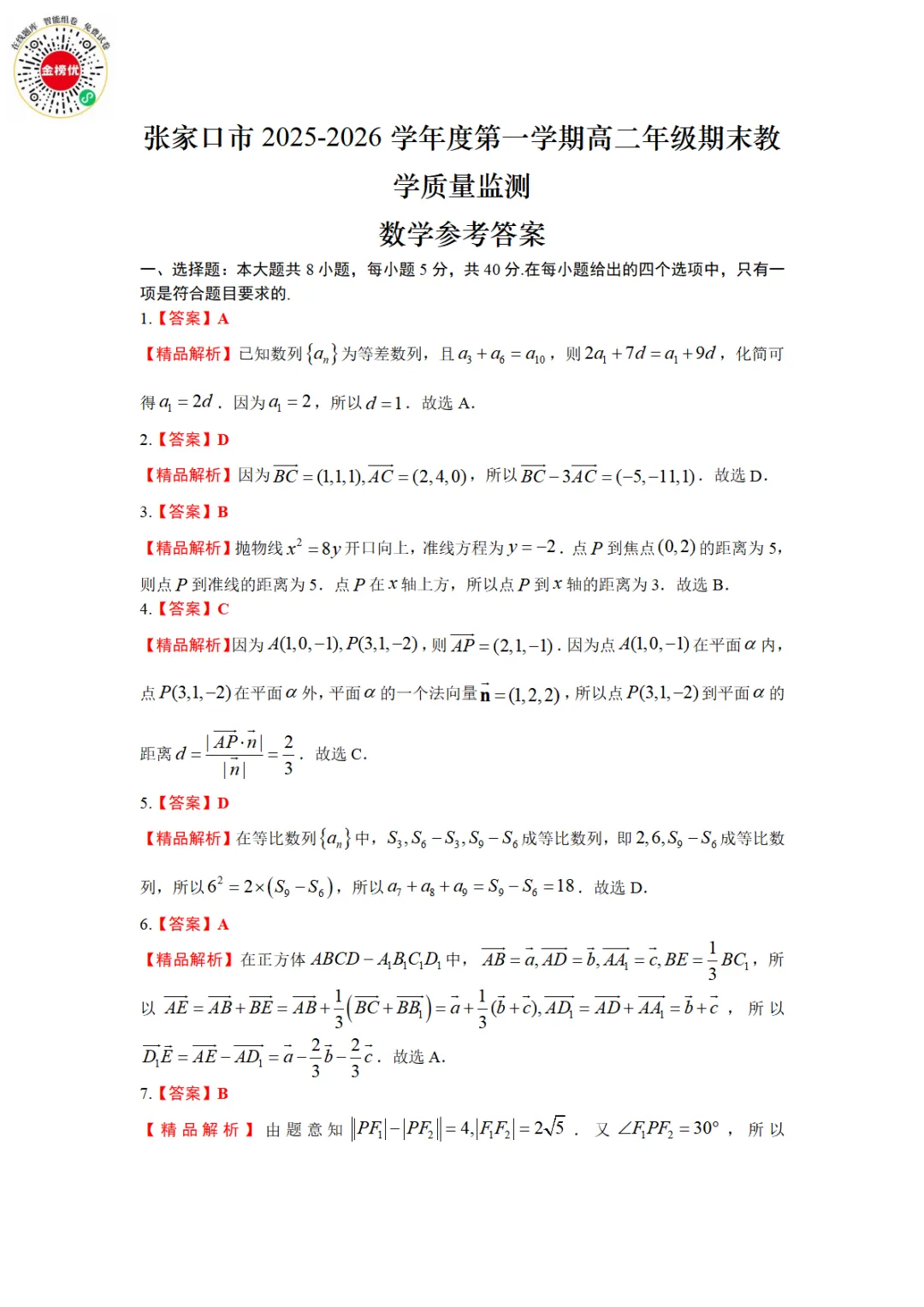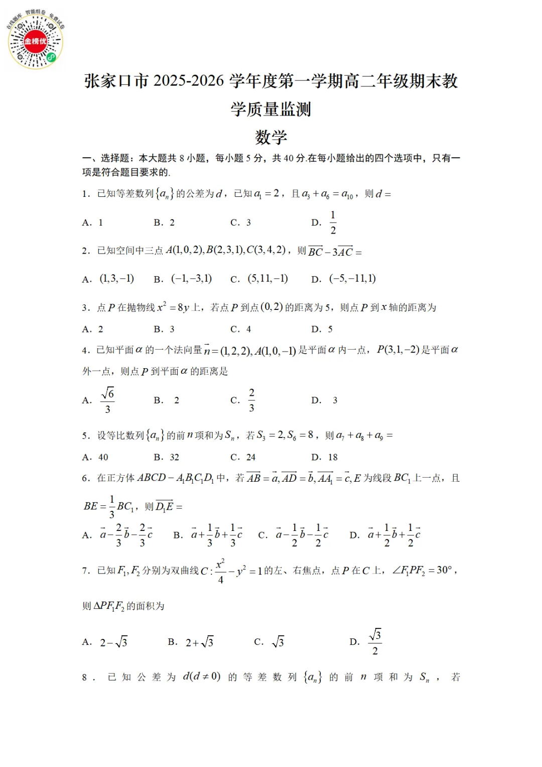 >【精品word版】河北张家口2025-2026学年度第一学期高二年级期末教学质量监测数学试题+答案