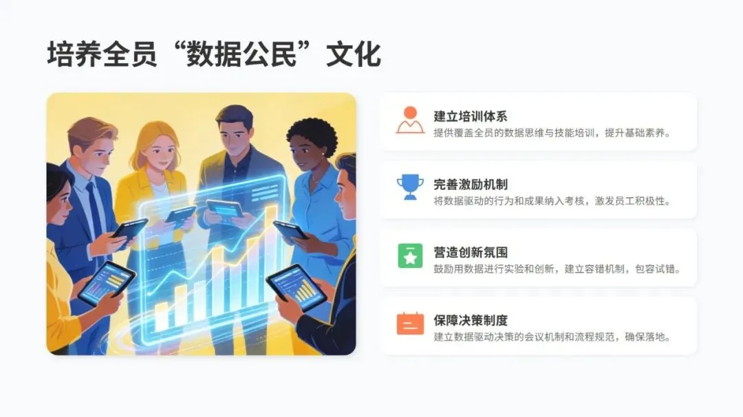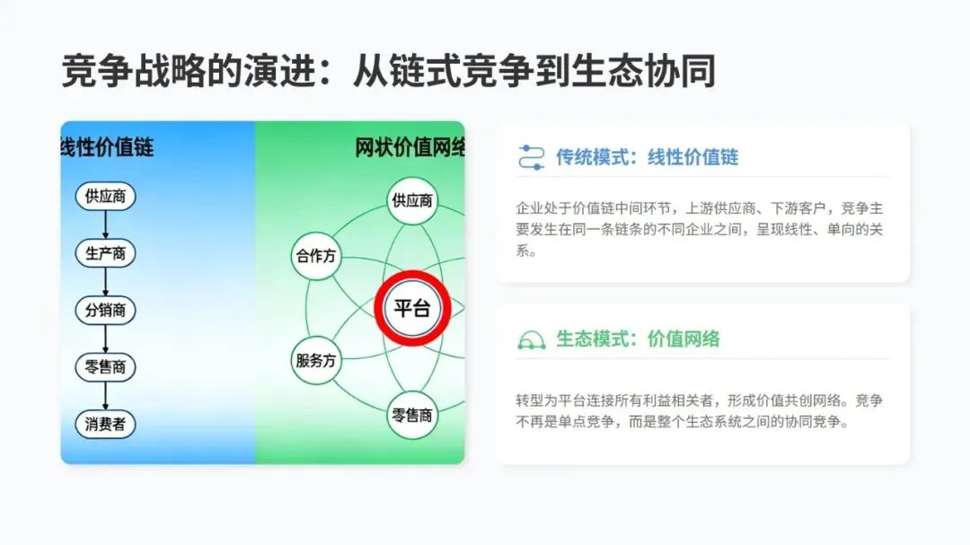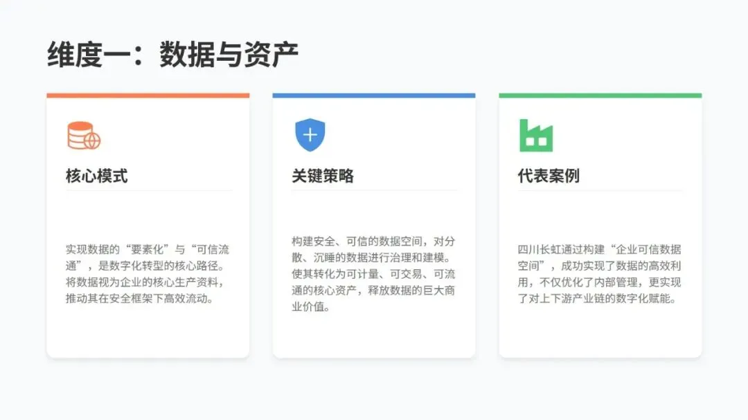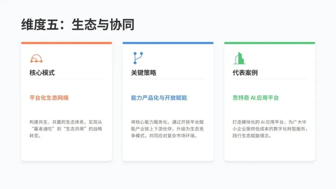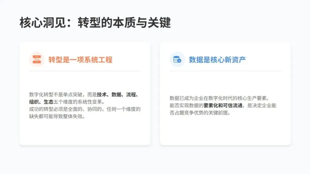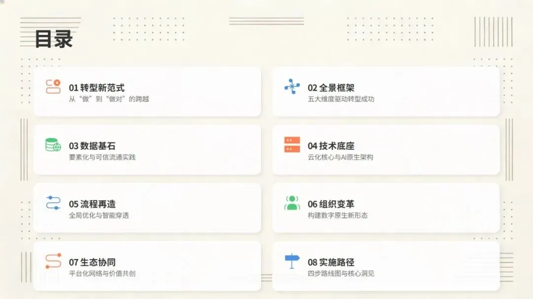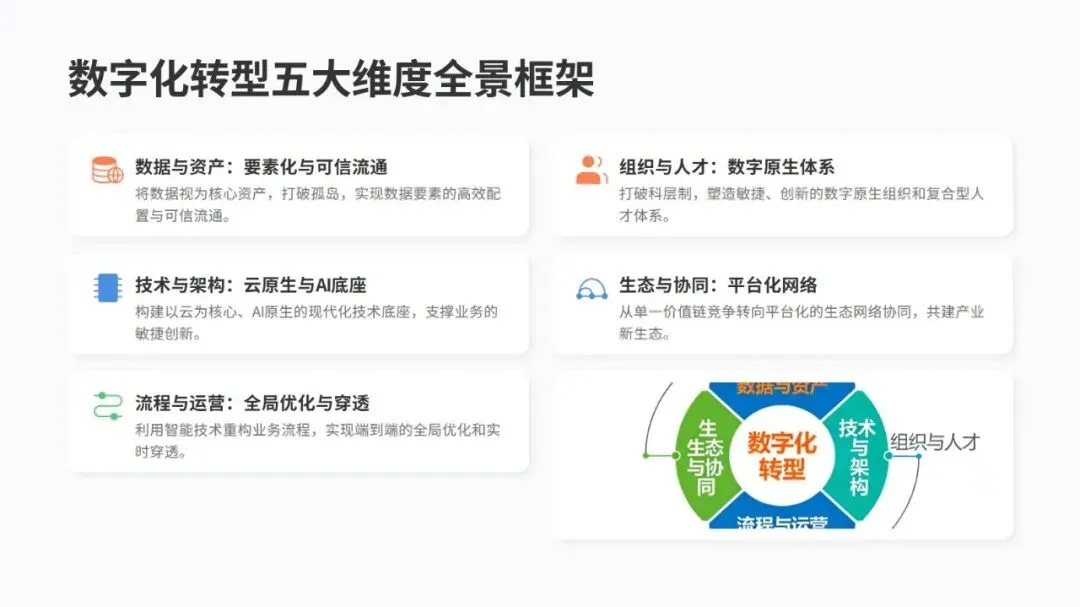 转型要靠五个核心维度发力:把数据当核心资产,打破信息孤岛,让数据安全高效流通;技术上搭建以云为基础、AI 为核心的架构;流程上用智能技术重构,实现全链路优化;组织上打破传统层级,打造敏捷创新的团队和复合型人才队伍;生态上从单打独斗转向平台化协同,共建产业新生态。