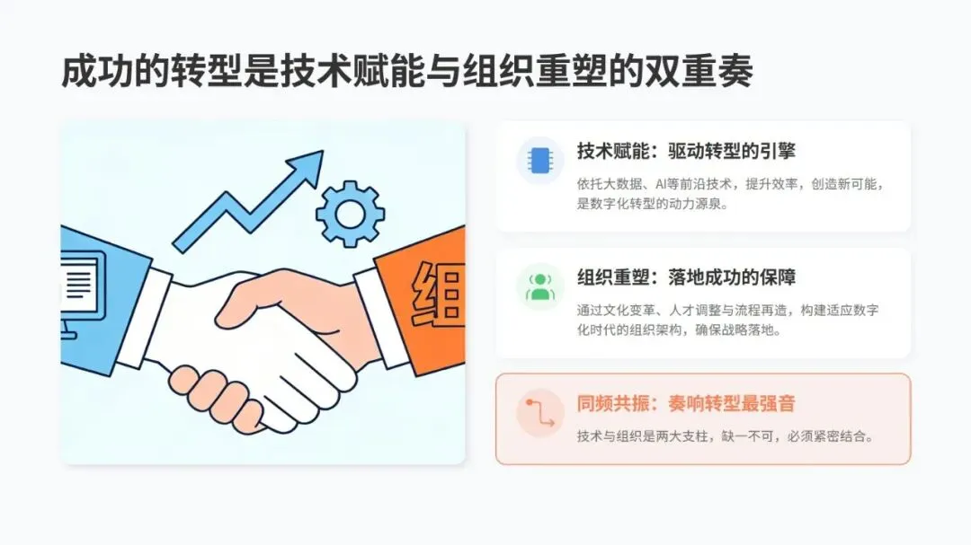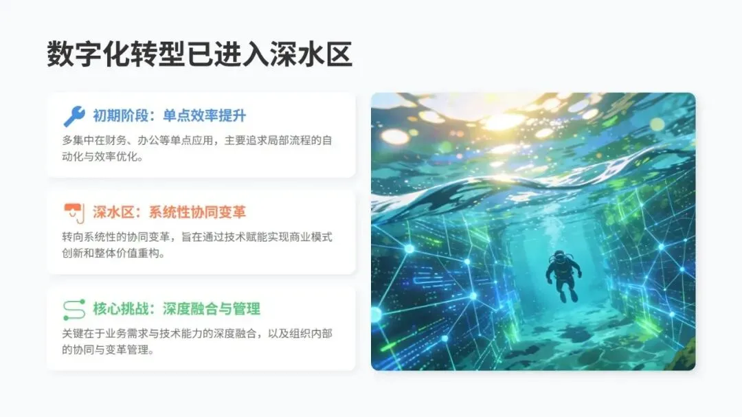 现在企业数字化转型已经进入深水区,不再是只做财务、办公等单点效率提升,而是朝着系统性的协同变革发展。想要转型成功,关键得让业务需求和技术能力深度融合,同时做好组织内部的协同与变革管理,技术赋能和组织重塑这两方面缺一不可,得配合到位。
