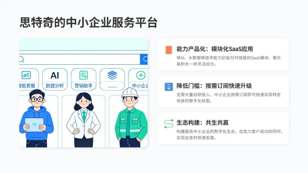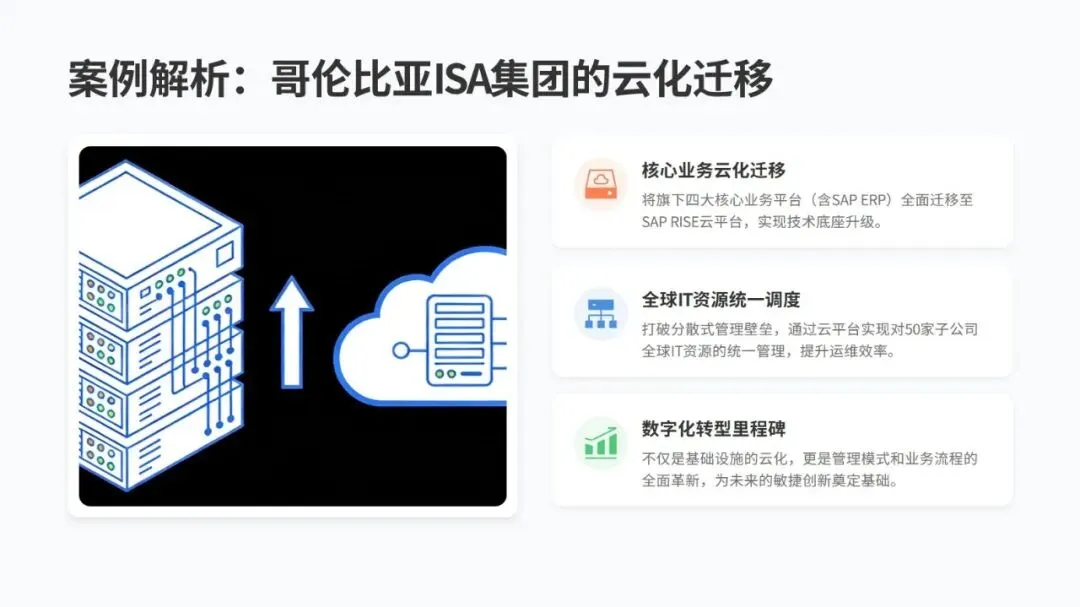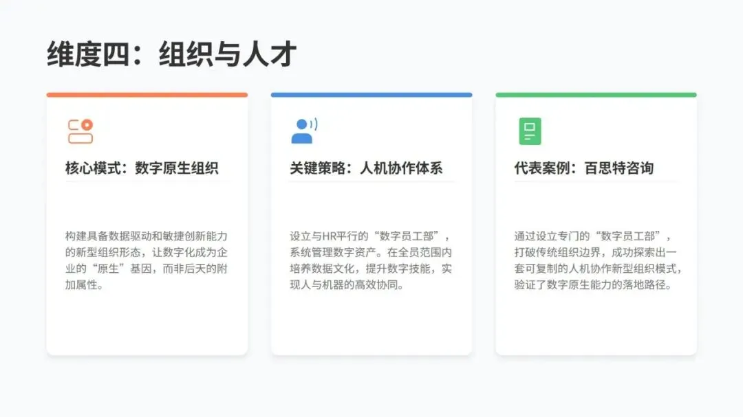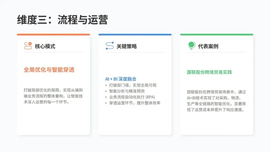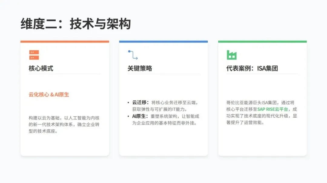 数据方面,四川长虹搭建 “企业可信数据空间”,整合大量核心数据,连接上千家合作伙伴,不仅理顺了内部管理,还帮上下游产业链实现了数字化升级,订单交付周期大幅缩短,成本也省了不少。技术上,哥伦比亚 ISA 集团把核心业务搬到 SAP RISE 云平台,统一管理全球 IT 资源,系统性能和运维效率都明显提升。流程上,国联股份用 AI+BI 技术打通采购、物流等全链路,采购、生产、物流效率都有显著提高。组织上,百思特咨询设立 “数字员工部”,和人力资源部并行管理,让人和机器高效配合。生态上,思特奇打造模块化 AI 应用平台,让中小企业能低成本实现数字化转型。
