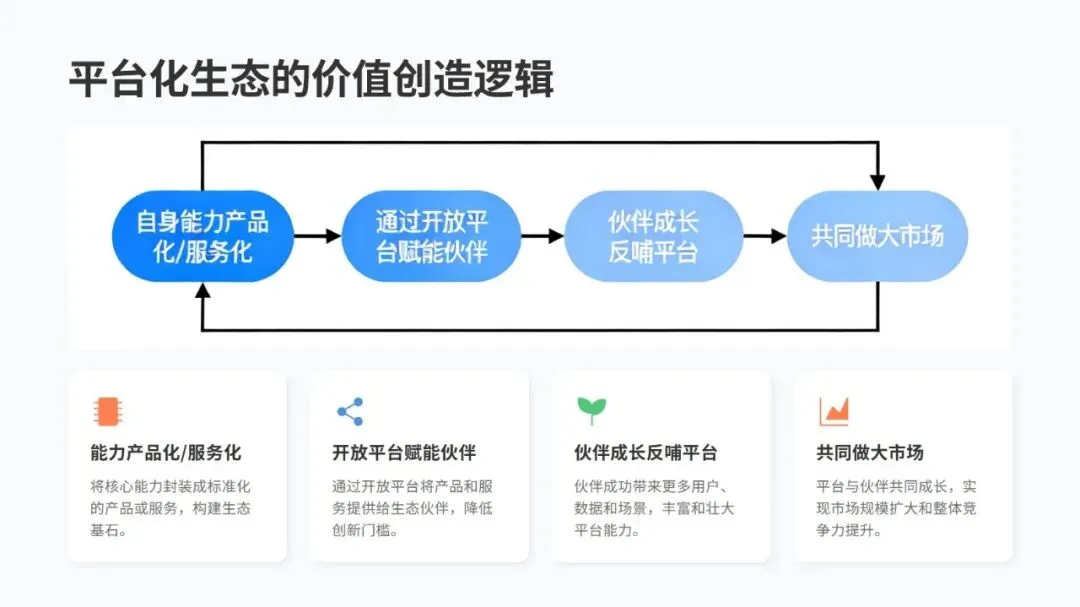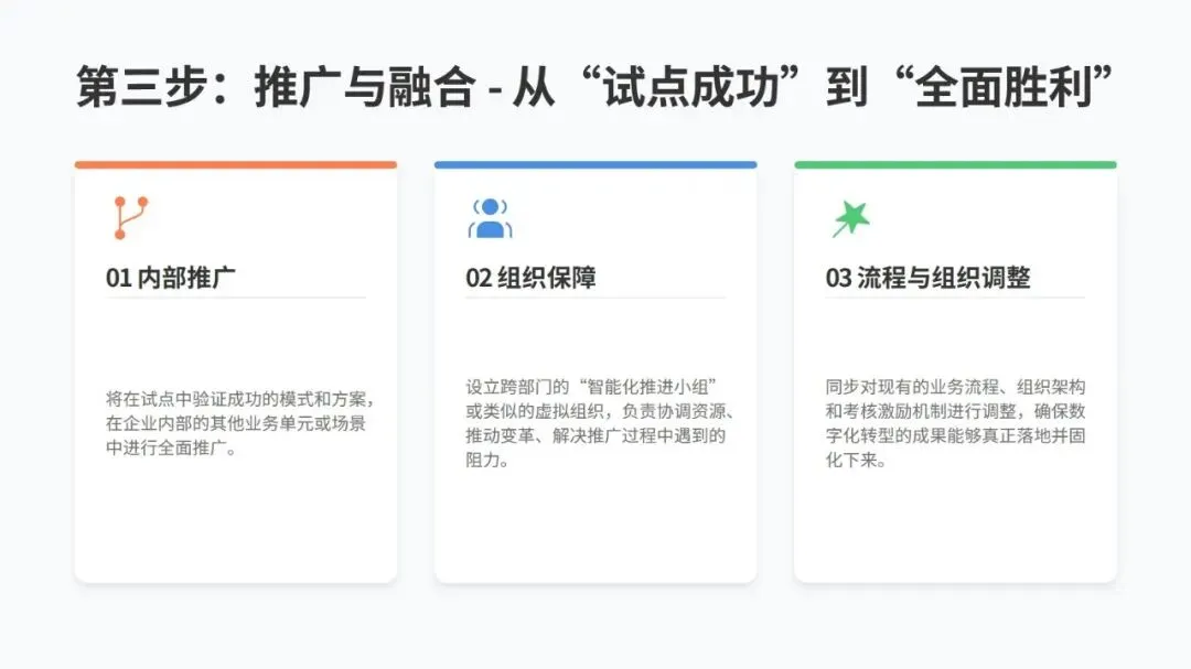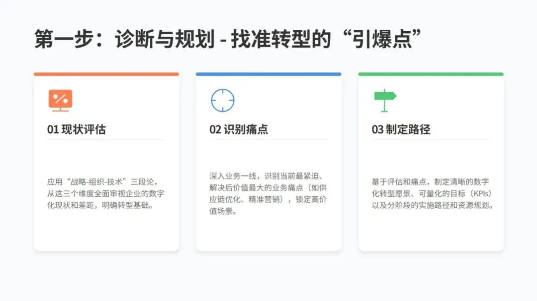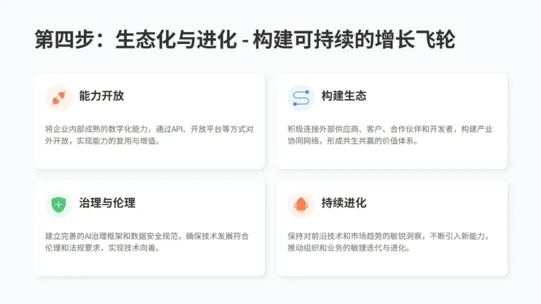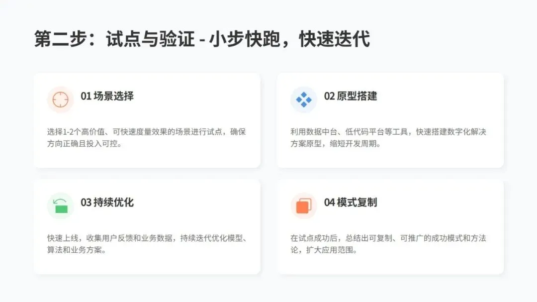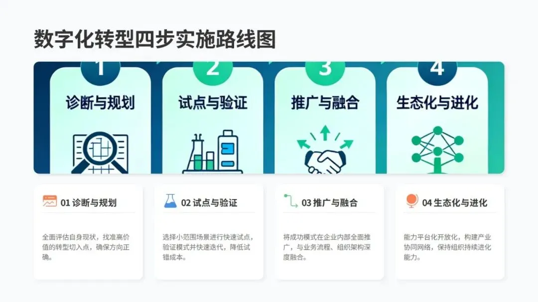 推进转型可以按四步走:先全面评估自身情况,找到关键痛点,制定清晰规划;再选 1-2 个高价值场景试点,快速搭建原型并不断优化,总结可复制的模式;接着在企业内部全面推广,调整流程和组织架构保障落地;最后开放自身数字化能力,连接合作伙伴构建生态,保持持续进化。