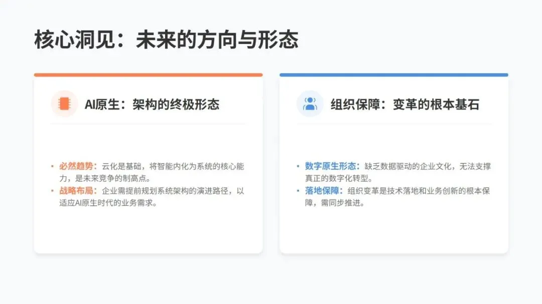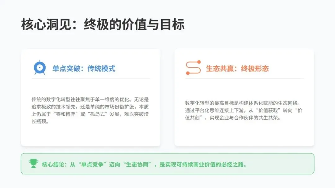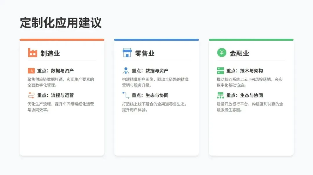 说到底,数字化转型不是某一个环节的突破,而是技术、数据、流程、组织、生态的全面协同。数据已经成为企业的核心资源,AI 原生架构和适配的组织形态是转型关键,最终要从单点竞争转向生态共赢,这样才能实现可持续的商业价值。不同行业侧重点不同,制造业要聚焦供应链和生产流程,零售业要做好用户画像和全渠道生态,金融业则要推进核心系统上云和开放平台建设。