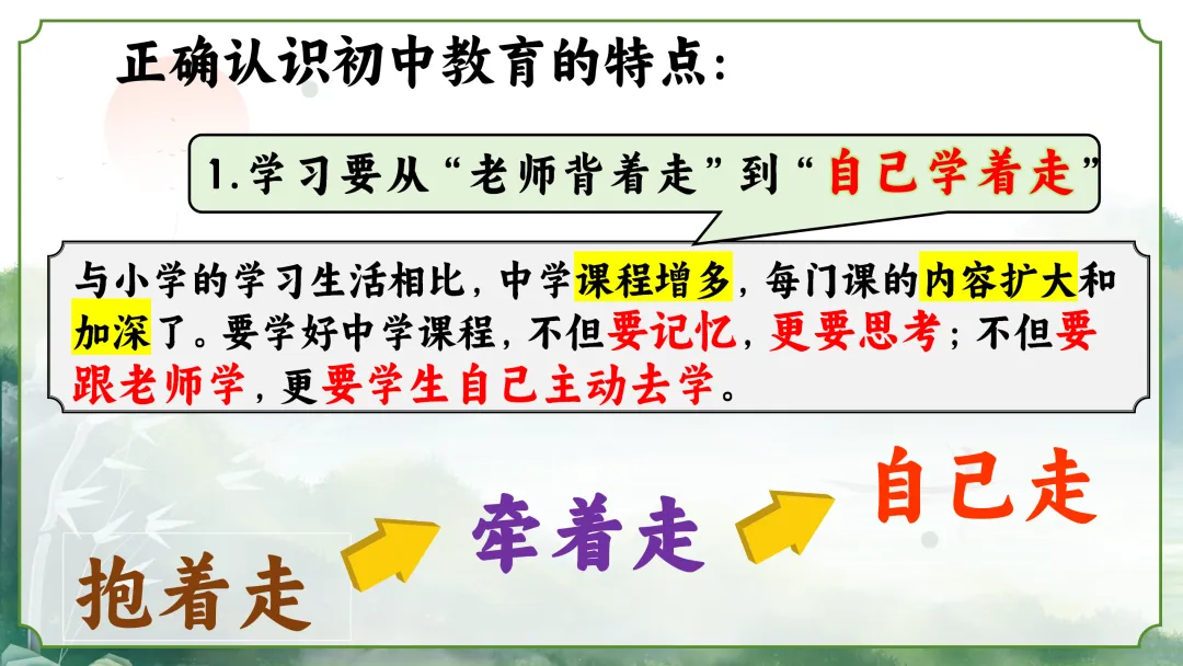 与小学的学习生活相比,中学课程增多,每门课的内容扩大和加深了。要学好中学课程,不但要记忆,更要思考;不但要跟老师学,更要学生自己主动去学。