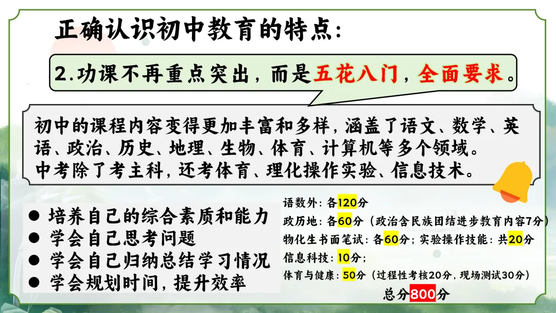 初中的课程内容变得更加丰富和多样,涵盖了语文、数学、英语、政治、历史、地理、生物、体育、计算机等多个领域。