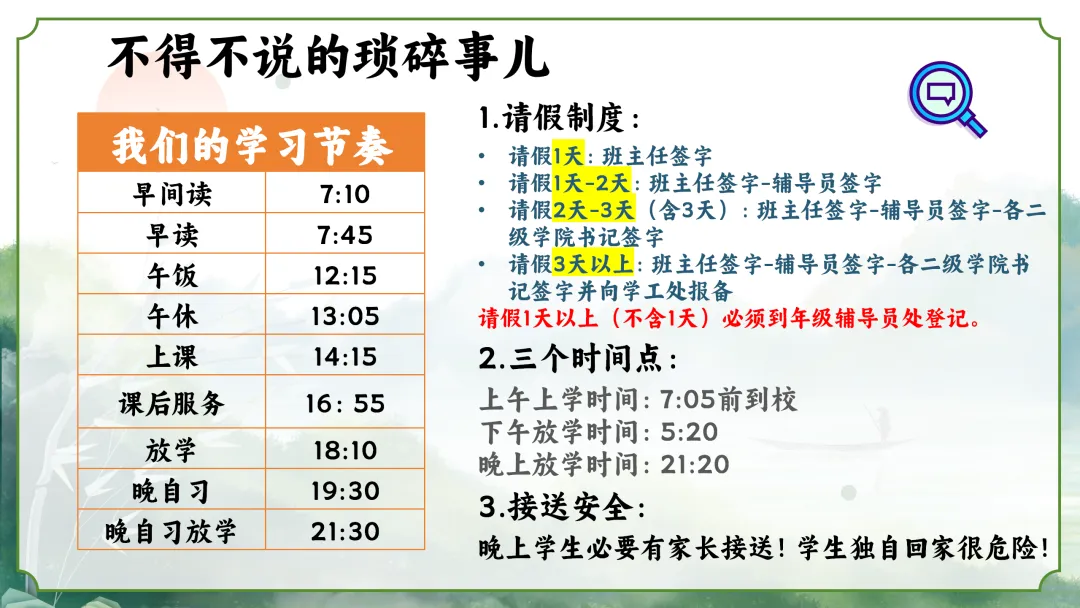 早间读:7:10 早读:7:45午饭:12:15 午休13:05