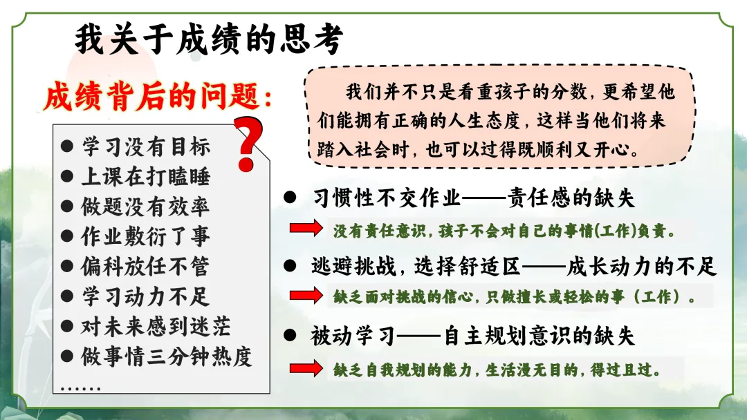 成绩背后的问题:学习没有目标;上课在打瞌睡;做题没有效率;作业敷衍了事;偏科放任不管;学习动力不足;对未来感到迷茫;做事情三分钟热度