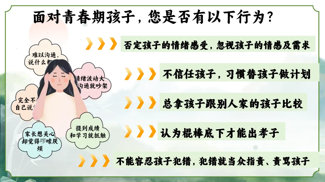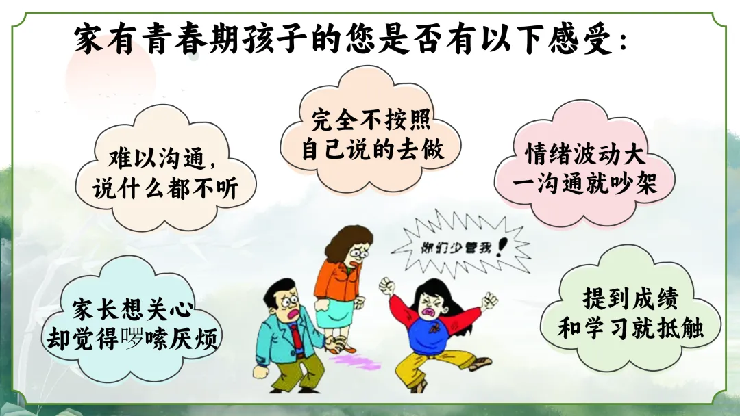 家长想关心却觉得啰嗦厌烦、难以沟通,说什么都不听、完全不按照自己说的去做、情绪波动大一沟通就吵架、提到成绩和学习就抵触
