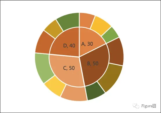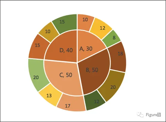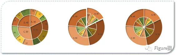 双层饼图,看起来又像是飞镖图,(尤其是上图右3的图),这类图主要用于类别之间存在包含关系的时候,单纯的一层饼图不能充分表达包含关系,或者是复合饼图不能显示多个类别之间存在的包含关系,所以今天小编就带大家来学学双层饼图吧。