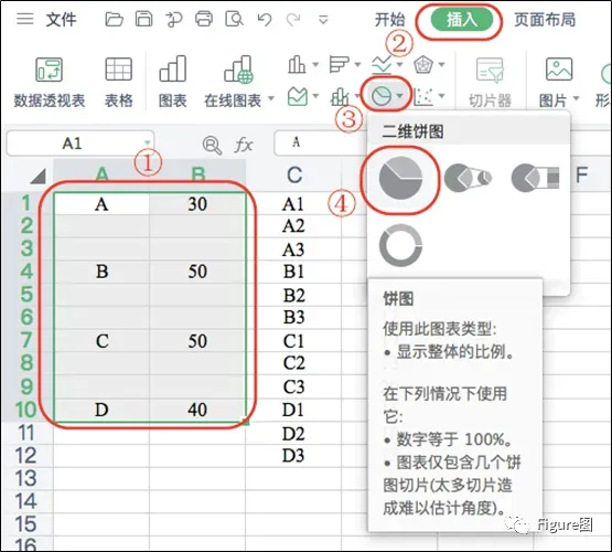 2.先选中主要的类别,依次点击“插入”→“二维饼图”→“饼图”,插入图表。