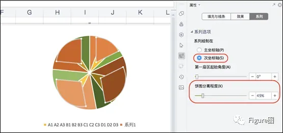 9. 选中主要类别的饼图,将其放于“次坐标轴”,并将饼图分离程度调整为50%左右,这样主要类别和次要类别就分离开来了。