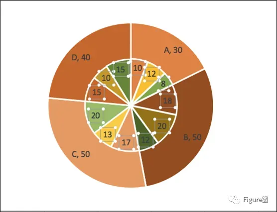 17. 都移到中心后,添加数据标签,使其看起来比较直观,这样第二类的双层饼图也完成啦。